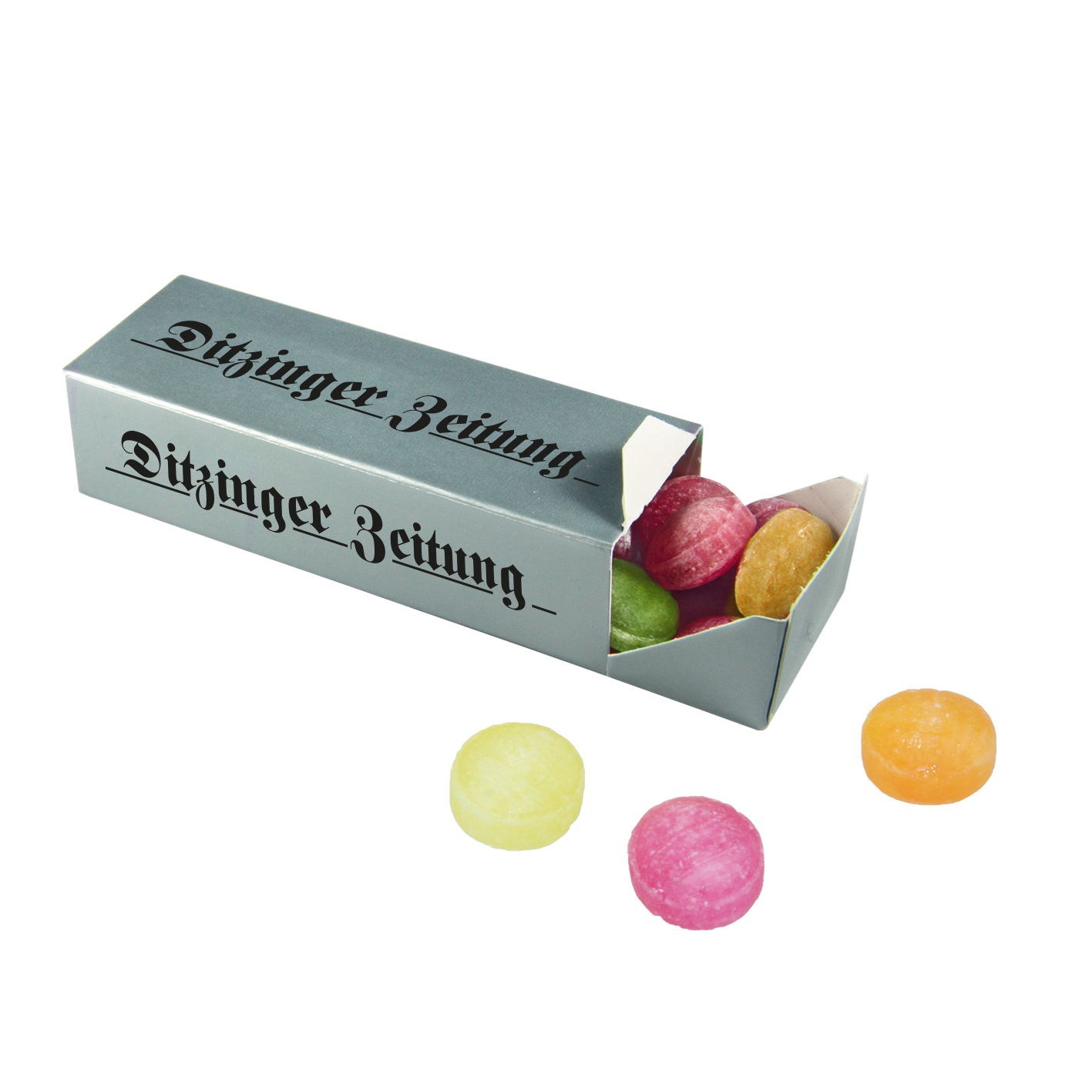 Produkt: PET-Dose, farblos-transparent mit Alu-Aufreißdeckel, auffälligem Werbe-Sleeve (rundum) aus transparenter Folie, individuell bedruckt und zusätzlichem Kunststoffdeckel zum Wiederverschließen br>Inhalt: Ungewickelte Bonbons in Nostalgieform, ca. 125 g br>Haltbarkeit: 24 Monate. br>Preise: € / Stück inkl. 4-c Digitaldruck auf Sleeve zzgl. Drucknebenkosten.