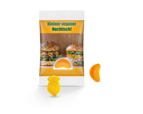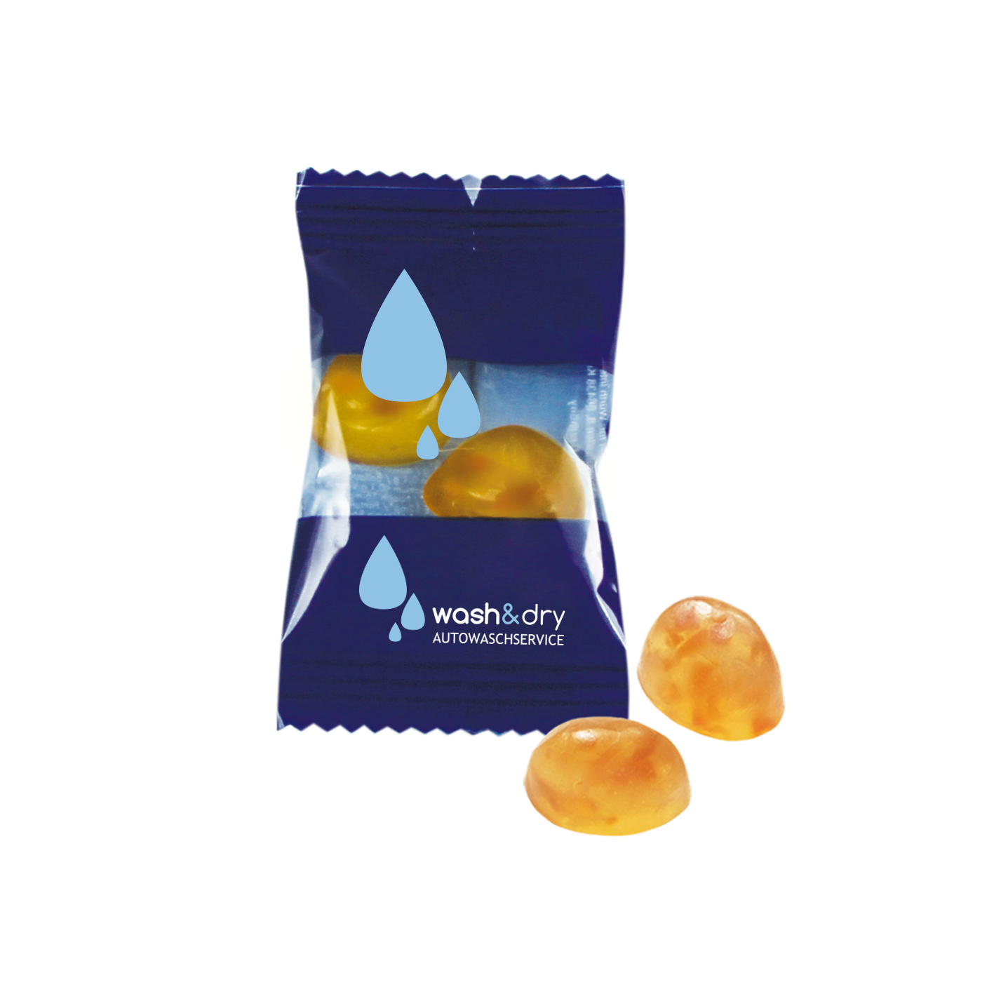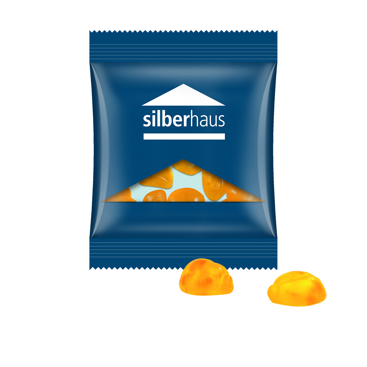Produkt: Zwei verpackte Vitaminfruchtgummi im Flowpack aus weißer Folie, individuell bedruckt br>Inhalt: Fruchtgummi der Marke Trolli in Fruchtsaft-Qualität mit Fruchtstückchen und 10 Vitaminen, ca. 6 g (2 Stück) br>Geschmacksrichtung: Pfirsich br>Haltbarkeit: 12 Monate br>Preise: € / Stück inkl. 3-c Flexodruck zzgl. Drucknebenkosten.