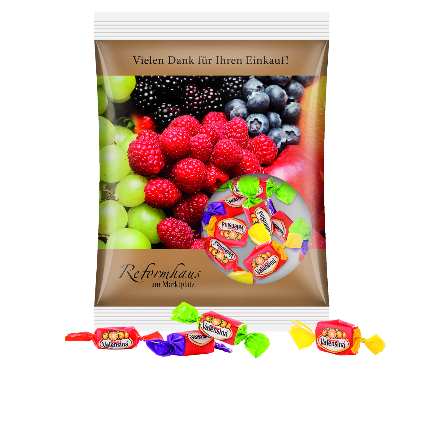 Produkt: Maxitüte aus transparenter Folie, individuell bedruckt br>Inhalt: Valensina 2 in 1 Kaubonbons im Original-Wickler in 4 fruchtigen Geschmackskombinationen. Mit natürlichen Aromen und Vitamin C. Ohne künstliche Farbstoffe, ca. 25 g br>Haltbarkeit: 12 Monate br>Preise: € / Tüte inkl. 1-c Flexodruck zzgl. Drucknebenkosten