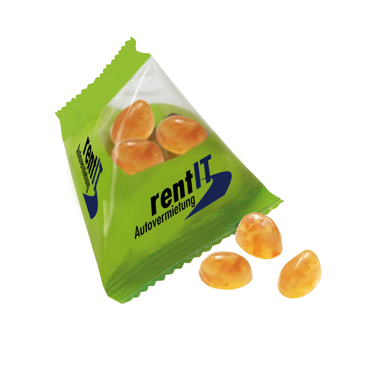 Produkt: Tetraeder aus transparenter Folie, individuell bedruckt br>Inhalt: Fruchtgummi der Marke Trolli in Fruchtsaft-Qualität mit Fruchtstückchen und 10 Vitaminen, ca. 15 g br>Geschmacksrichtung: Pfirsich br>Haltbarkeit: 12 Monate br>Preise: € / Tetraeder inkl. 4-c Flexodruck zzgl. Drucknebenkosten.