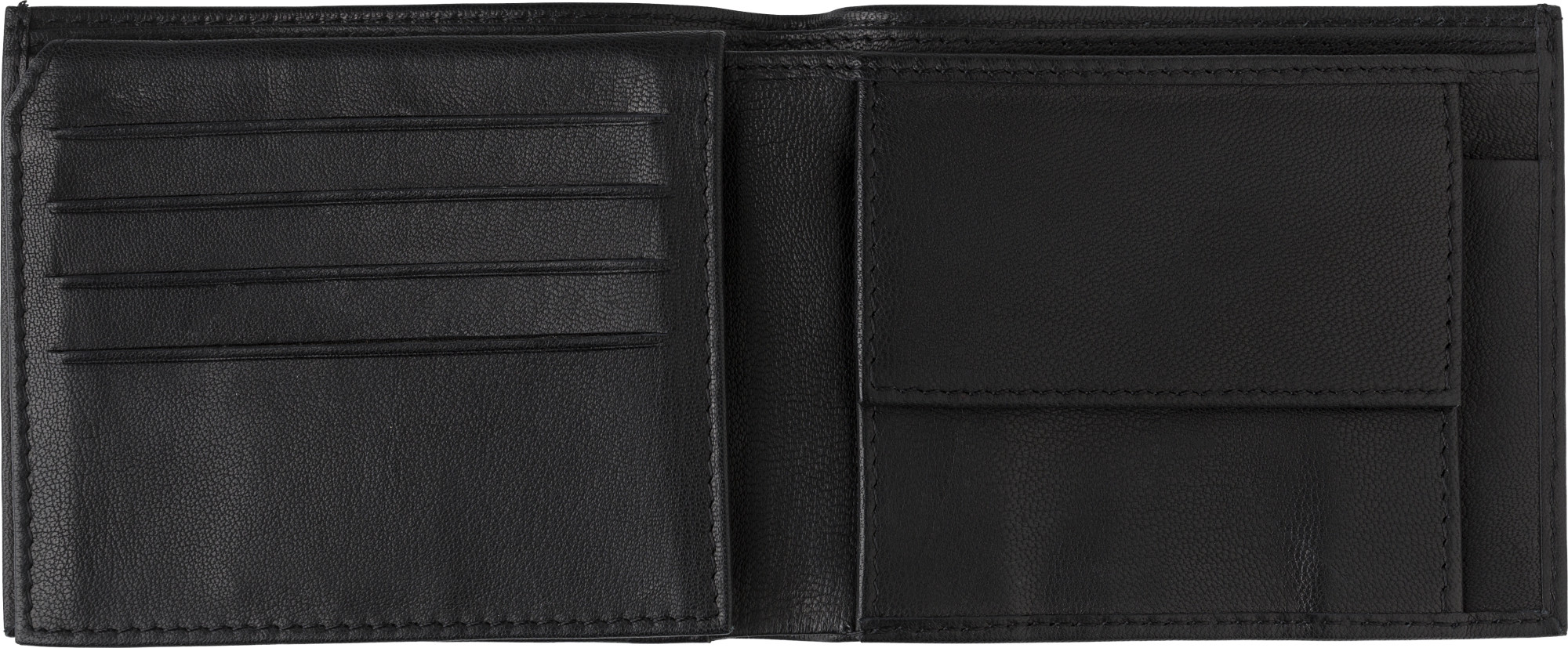 RFID-Geldbörse aus Leder (Ziegenleder) mit Münzfach, das mit einem Druckknopfverschluss verschlossen wird, und verschiedenen anderen Fächern für Bargeld oder Karten.