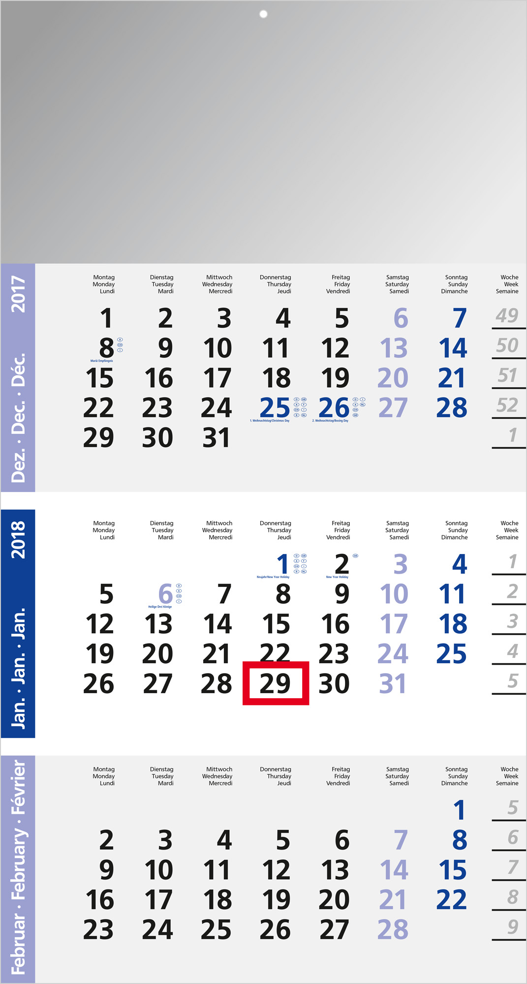 Kalendarium: Deutsch 3sprachig D/GB/F; blau; Ausstattung: Kalenderblätter perforiert und Rückwand gerillt zum Falten auf B4-Großbrief-Format; Datumsschieber rot; Druck: 4C-Quality Digital inklusive; Werbefläche: 300 x 150 mm am Kopf; Format: 300 x 560 mm gesamt; 300 x 420 mm Kalendarium; Verpackung: Nr. 03 - 350 x 250 mm; Nr. 17 - 313 x 250 x 19 mm; Nr. 43 - 350 x 250 mm;