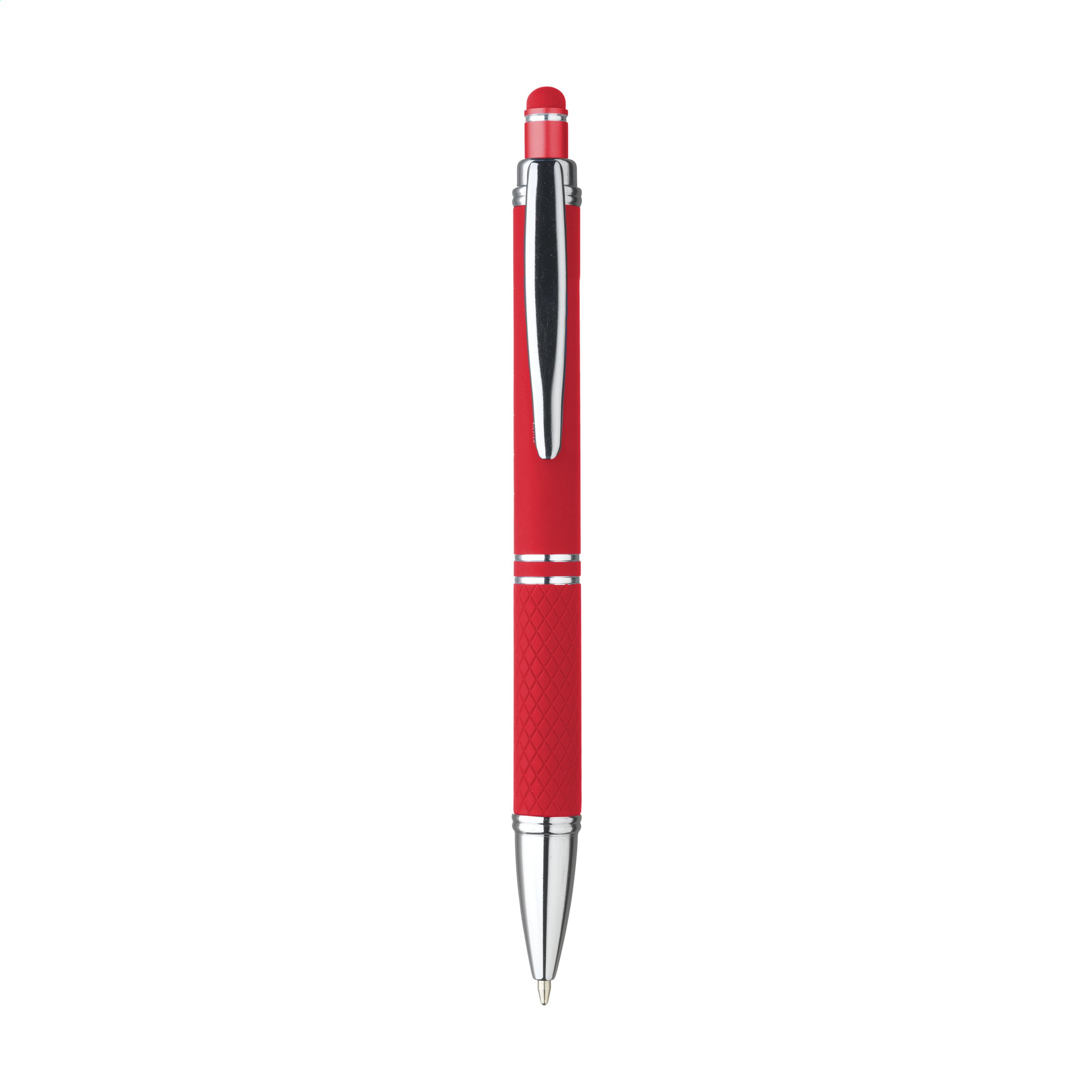 Blauschreibender Aluminium-Kugelschreiber mit Metallclip und gummierter Spitze für das Bedienen von Touchscreens (wie iPhone/iPad). Der Halter ist mit einer schönen gummierte Soft-Touch-Oberfläche versehen. Auf dem Vorderteil ist ein spielerisches Relief angebracht, das für einen festen Griff sorgt. Bei diesem Stift wurde viel Wert auf kleine zusätzliche Details gelegt. Das macht sein Design auffallend attraktiv.