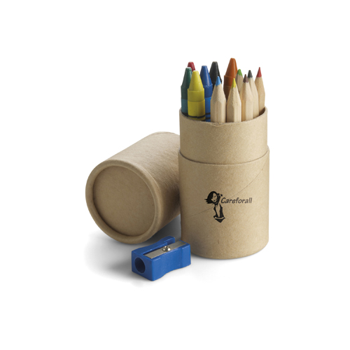 Malset bestehend aus 6 Wachsmalstiften (kurz), 6 Buntstiften (kurz) und Kunststoff-Anspitzer.