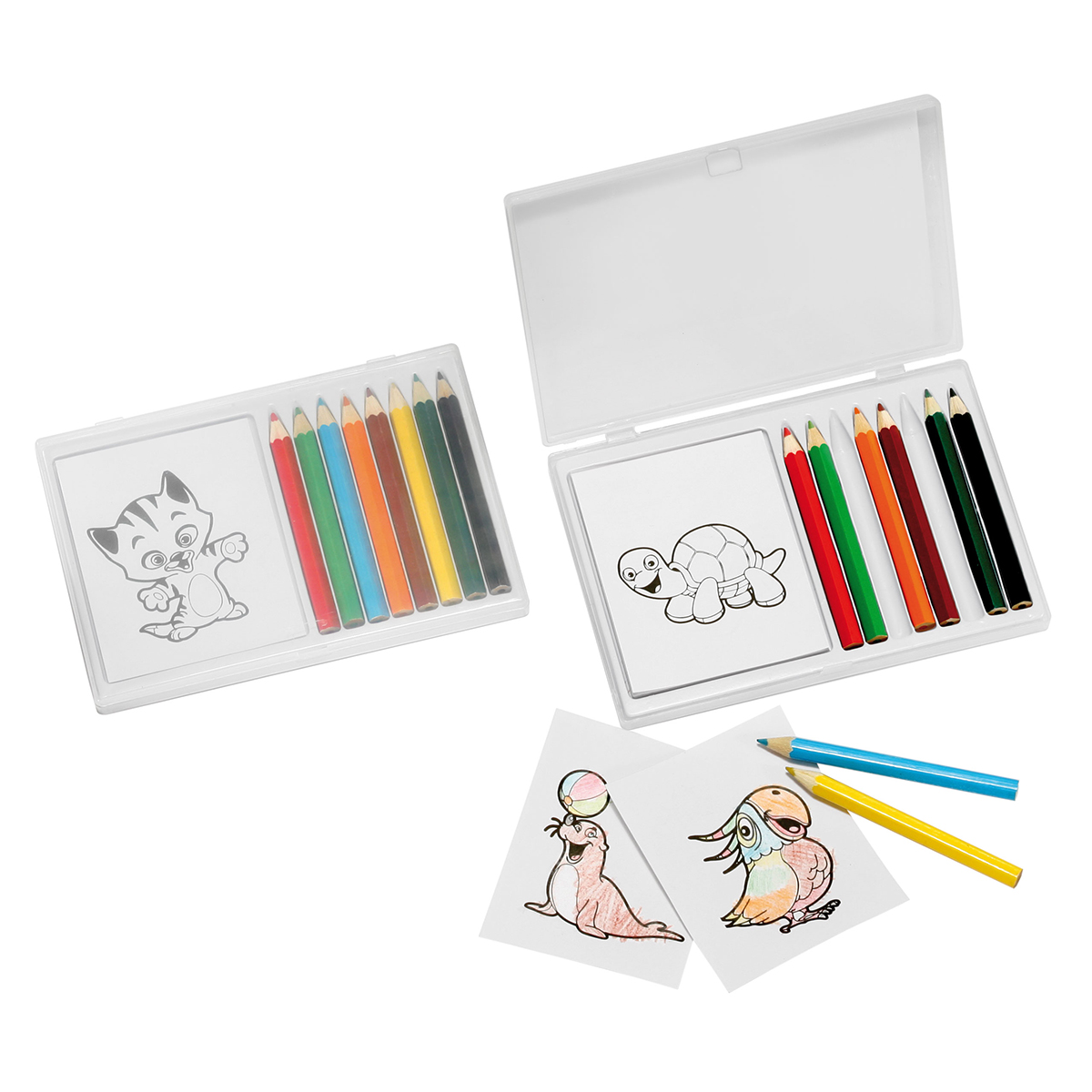 Malset, 8 Buntstifte und 12 Malvorlagen in Box mit transparentem Deckel. Die ideale Kinder-Beschäftigung für unterwegs..