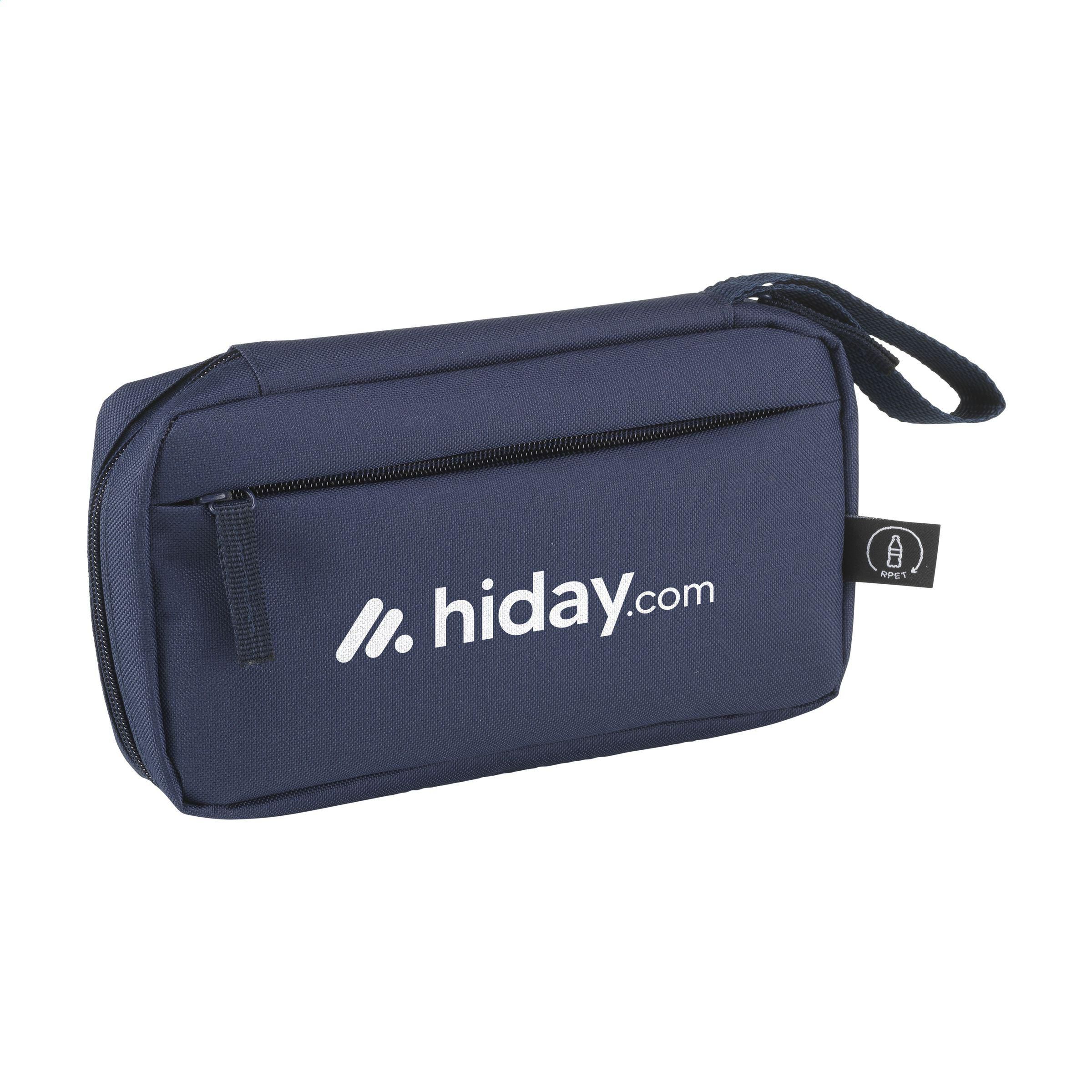Etui zur geordneten und übersichtlichen Aufbewahrung von Kabeln, Ladegeräten und technischem Zubehör. Hergestellt aus 600D RPET-Polyester. Das Innere bietet reichlich Stauraum, unterteilt in mehrere (Netz-)Fächer. Mit Reißverschluss, einer zusätzlichen Reißverschlusstasche an der Außenseite und einer praktischen Trageschlaufe. Ideal für Reisen, aber auch praktisch für zu Hause oder im Büro. GRS-zertifiziert. Gesamtes recyceltes Material: 88%.