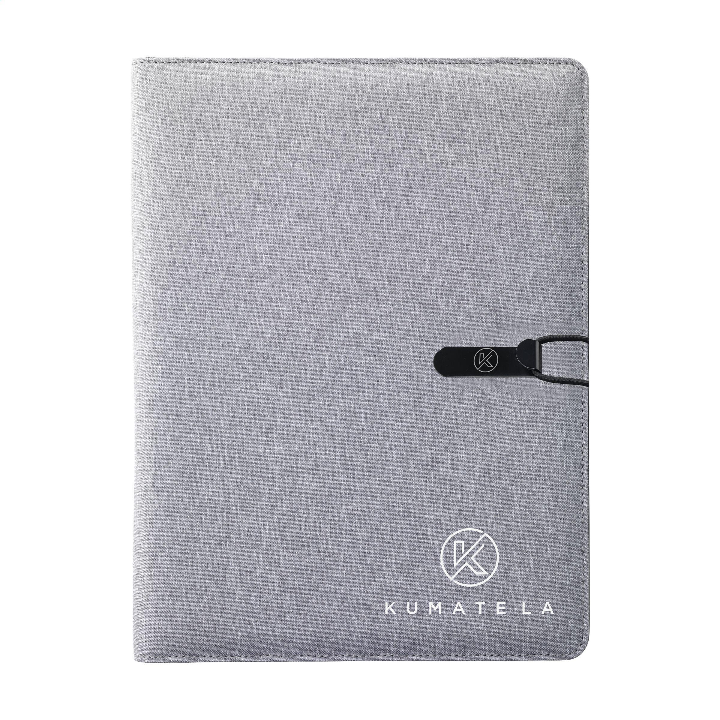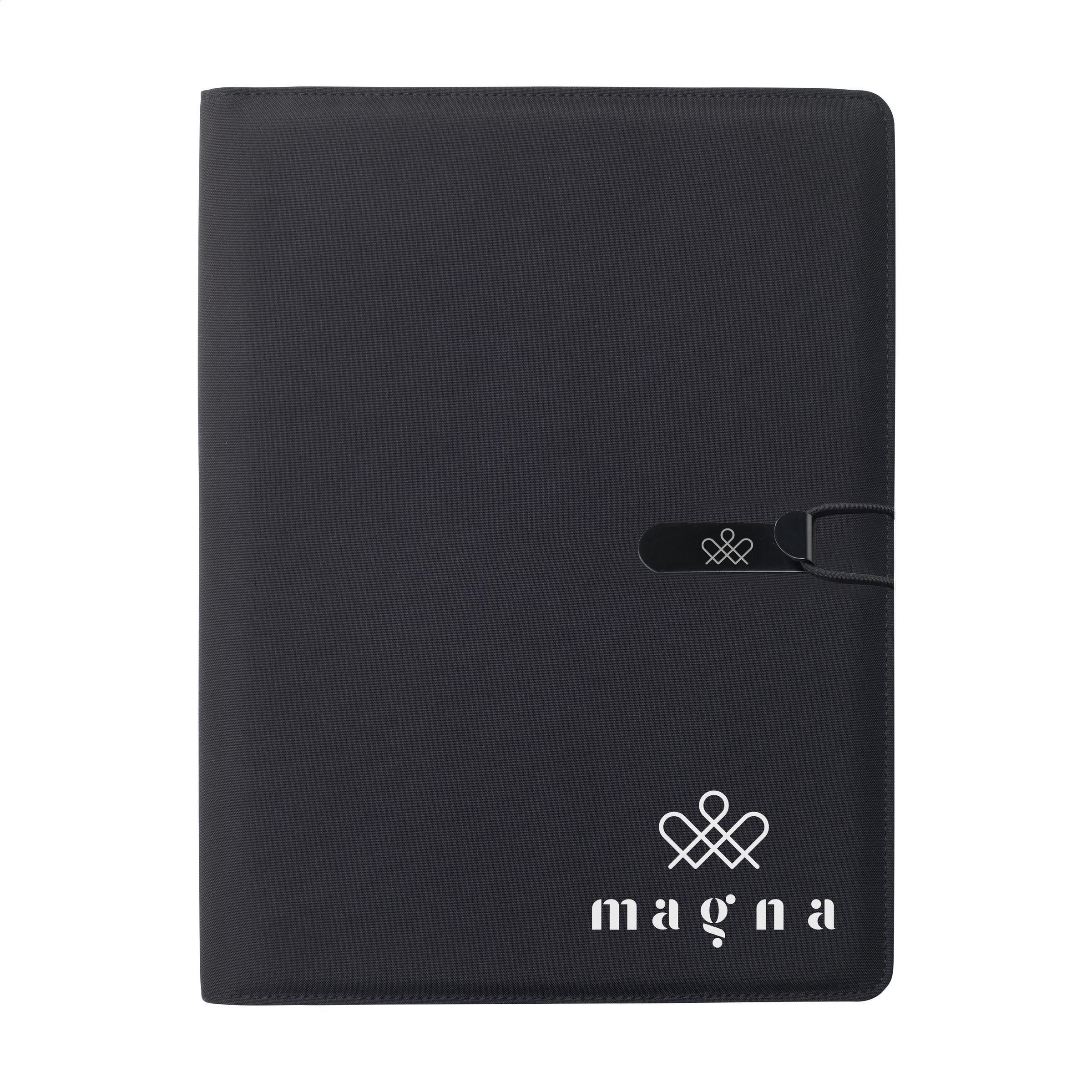 Moderne Schreibmappe/Dokumentenmappe aus RPET-Material im A4-Format. Ausgestattet mit mehreren Einsteckfächern, darunter ein separates Fach zur Aufbewahrung eines Mobiltelefons, sowie einer Stiftschlaufe. Inkl. Schreibblock mit 20 Blatt FSC zertifiziertem, weißem, liniertem Papier (70 g/m²). RCS-certified. Total recycled material: 6%.