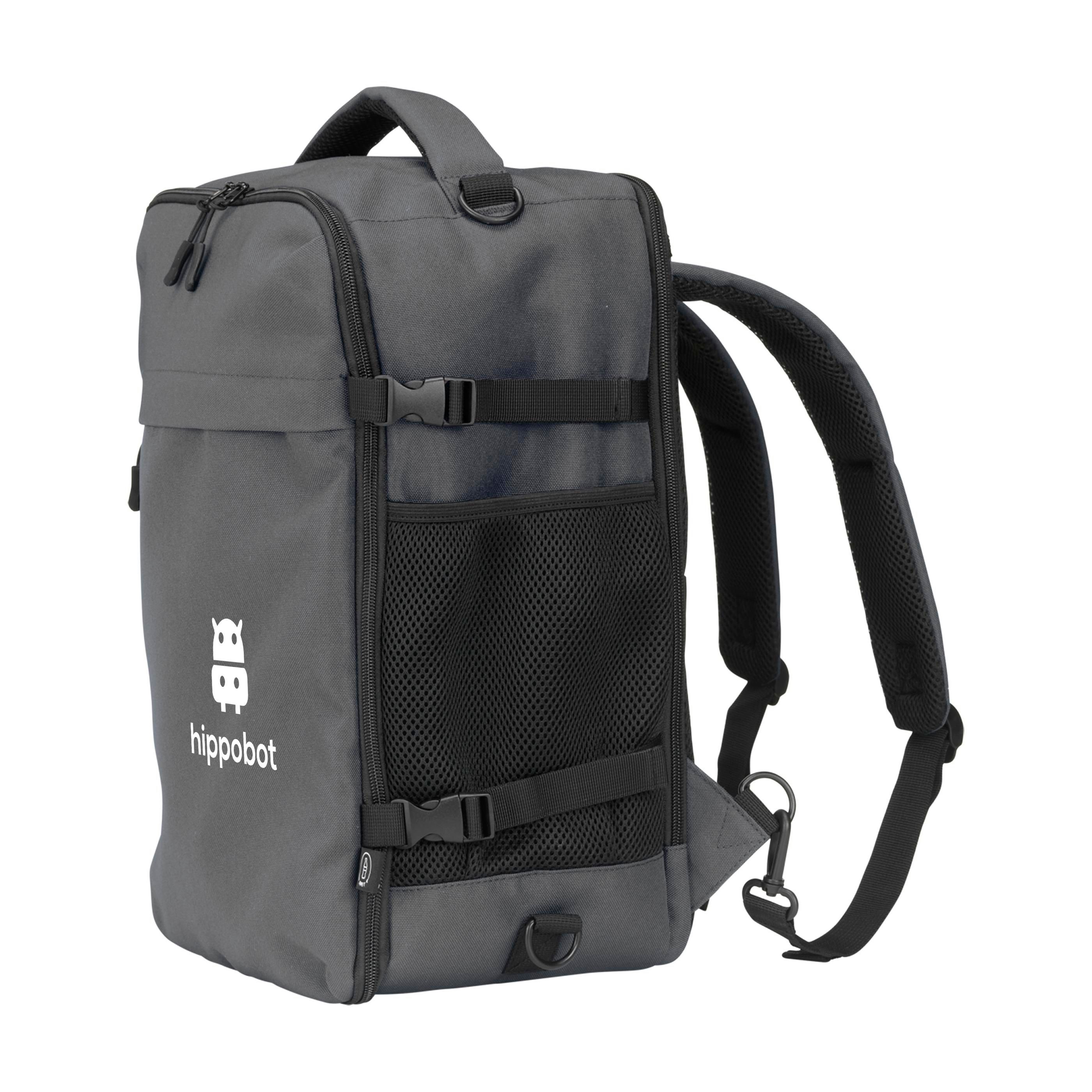 Dieser kompakte und vielseitige Cabin Flight Rucksack wurde als Handgepäck für alle Fluggesellschaften entwickelt. Er passt problemlos unter jeden Flugzeugsitz. Mit einem Fassungsvermögen von ca. 20 Litern bietet der Rucksack überraschend viel Stauraum, während sein geringes Gewicht für hohen Tragekomfort sorgt. Die Außenseite besteht aus robustem recyceltem RPET 900D-Polyester. Komplett gefüttert mit recyceltem RPET 210D-Polyester.Das geräumige Hauptfach mit Reißverschluss und doppelten Schiebern ist ideal für Kleidung und verfügt über einen praktischen Organizer für Telefon, persönliche Dokumente und andere wichtige Dinge. Ein zusätzliches gepolstertes Laptopfach bietet sicheren Schutz für Laptops bis zu 15,6 Zoll. Die Tasche hat auf beiden Seiten elastische Netztaschen, ideal für eine Wasserflasche oder kleine Accessoires. Auf der Rückseite befindet sich ein zusätzliches Reißverschlussfach. Die Schultergurte sind oben in diesem Reißverschlussfach befestigt und unten mit einem Karabinerhaken verschlossen. Durch Lösen der Haken können die Gurte vollständig im Reißverschlussfach verstaut werden, wodurch die Tasche noch kompakter wird.Die verstellbaren, gepolsterten Schultergurte, das gepolsterte Rückenteil und der stabile Griff mit Mesh-Futter sorgen für optimalen Tragekomfort, auch auf längeren Reisen. Inklusive abnehmbarem Schultergurt. Ein integrierter Trolley-Gurt erleichtert das Befestigen des Rucksacks an einem Koffer. Dieser Rucksack ist der perfekte Begleiter für jede Flugreise. GRS-zertifiziert. Gesamtes recyceltes Material: 50%.