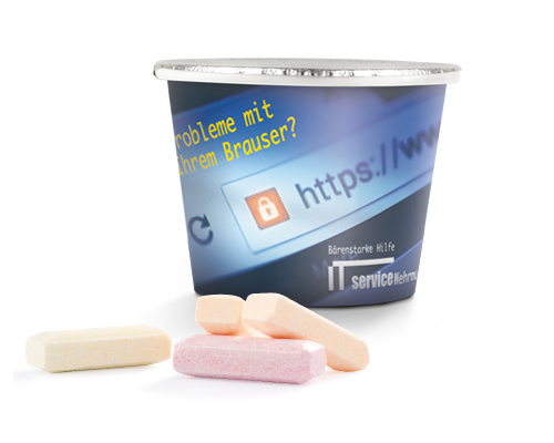 Produkt: Brausebärchen im Becher aus weißem Karton, frischeversiegelt mit Alu-Aufreißdeckel. Die Papierbanderole wird individuell bedruckt br>Inhalt: Sadex Brausebärchen, bunt gemischt, ca. 40 g br>Haltbarkeit: 12 Monate br>Preise: € / Stück inkl. 4-c Digitaldruck zzgl. Drucknebenkosten.
