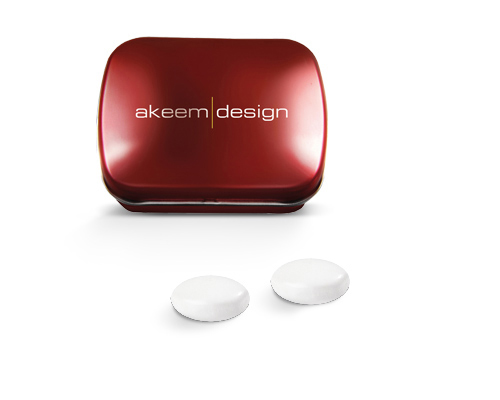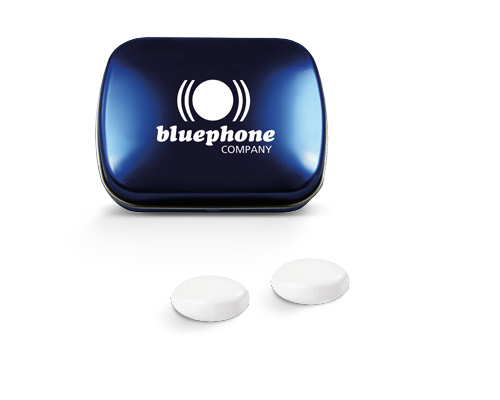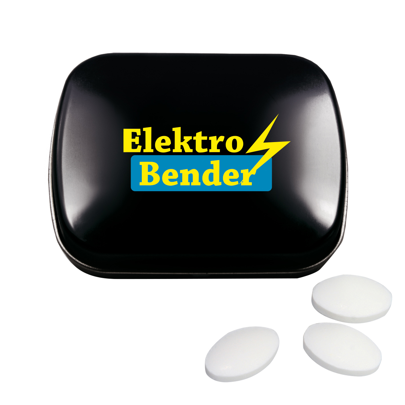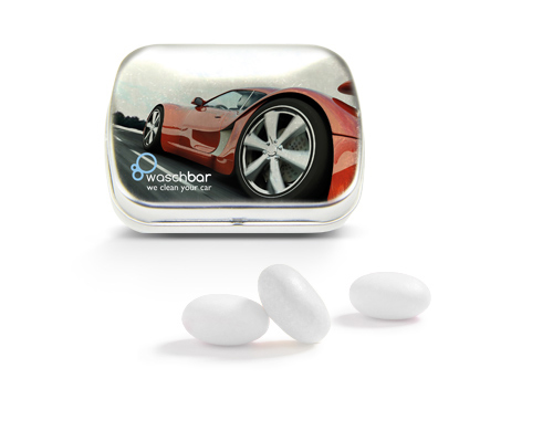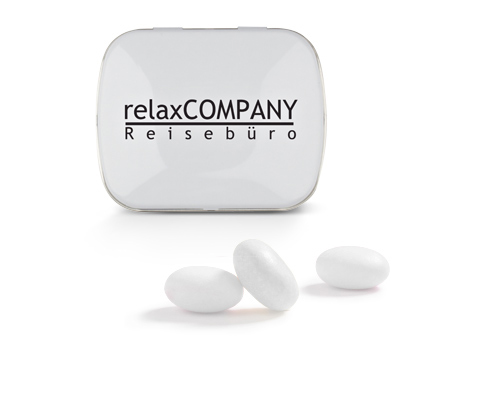 Produkt: Scharnierdeckel-Dose mit gewölbtem Deckel, weiß aus Metall, individuell bedruckt, mit Originalitätsverschluss und Aufreißperforation br>Inhalt: Mentos Kaubonbon in der Geschmacksrichtung Mint, ca. 25 g br>Haltbarkeit: 12 Monate br>Preise: € / Stück inkl. 4-c Tampondruck zzgl. Drucknebenkosten.