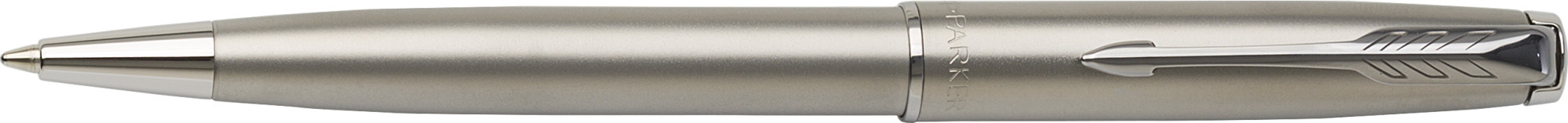 Parker Drehkugelschreiber Sonnet Schaft und Kappe aus Edelstahl, akzentuiert durch Clip und Zierleiste in Chromoptik. Schreibfarbe: schwarz. Verpackt in einer Geschenkbox.
