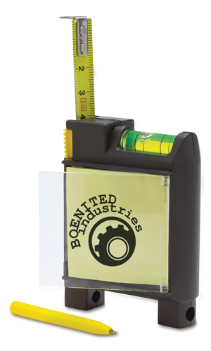Maßband aus Kunststoff, Messbereich 2 m, mit Kugelschreiber mit blauer Mine, Notizblock, Maßband, Wasserwaage und Gürtelclip.