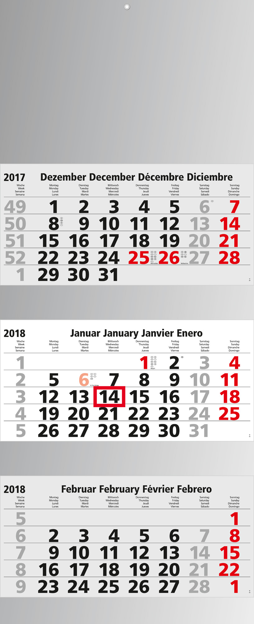 Format: 335 x 805 mm gesamt; 335 x 160 mm je Kalenderblock; Kalendarium: Deutsch 4sprachig D/GB/F/E; hellgrau; Verarbeitung: Kalenderblocks einzeln perforiert; Rückwand zum dreimaligen Falten gerillt; Blockhalter-Stanzung ; Aufhängeöse aus Metall; Ausstattung: Datumsschieber rot; Druck: 4C-Quality Digital inklusive; Verpackung: Wellpapp-Verpackung weiß:; Nr. 46 — 351 x 225 x 20 mm; B4-Großbrief-Format; Werbefläche: 335 x 210 mm am Kopf; 335 x 40 mm auf den Zwischenleisten; 335 x 35 mm auf der Fußleiste;