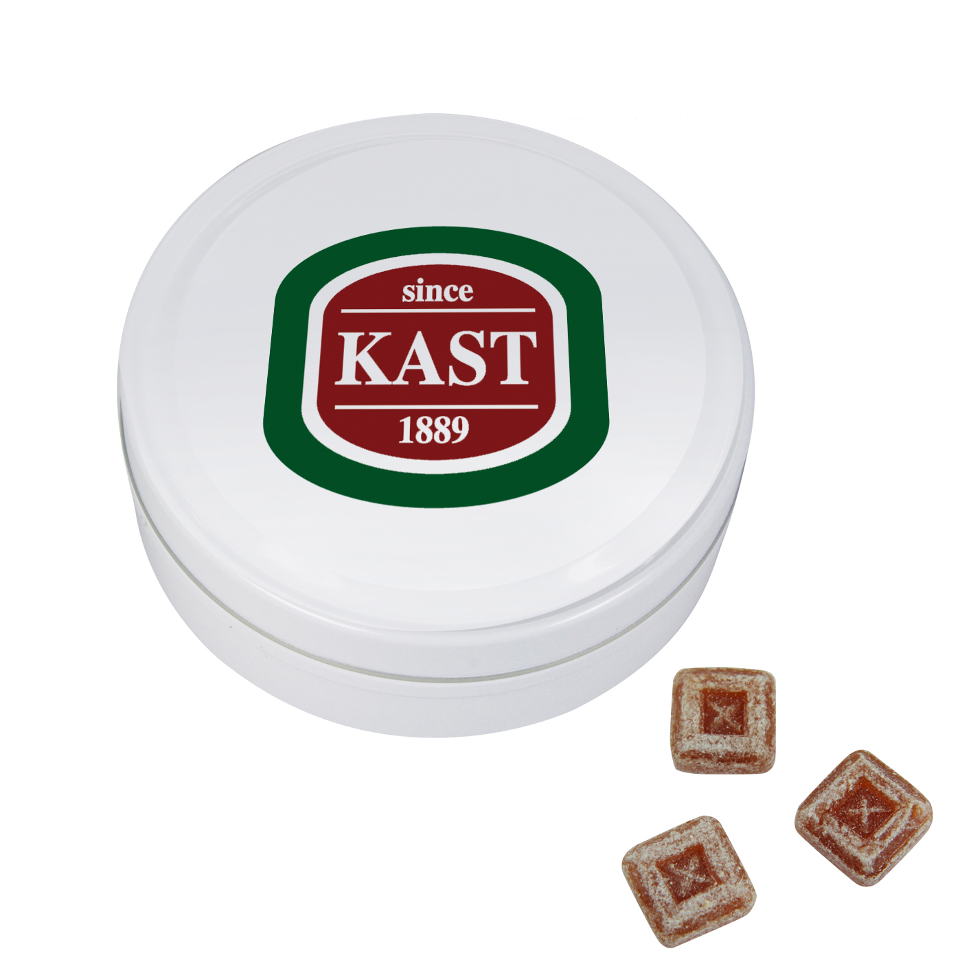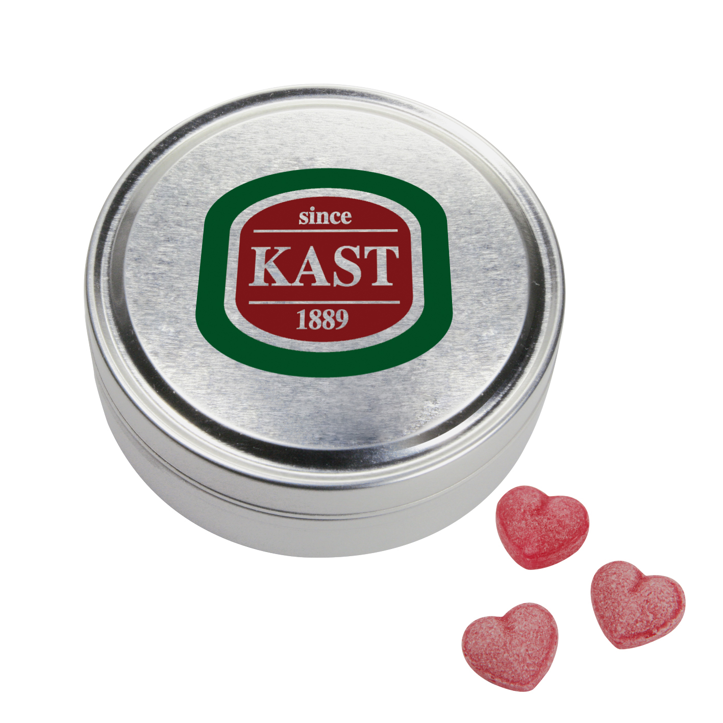 Produkt: Runde Dose mit Stülpdeckel, blank aus Metall, individuell bedruckt. Frische-Versiegelung rundum mit Etikett br>Inhalt: Kirschherzen, ungewickelte Bonbons in Nostalgieform, ca. 120 g br>Haltbarkeit: 24 Monate br>Preise: € / Stück inkl. 1-c Tampondruck zzgl. Drucknebenkosten.