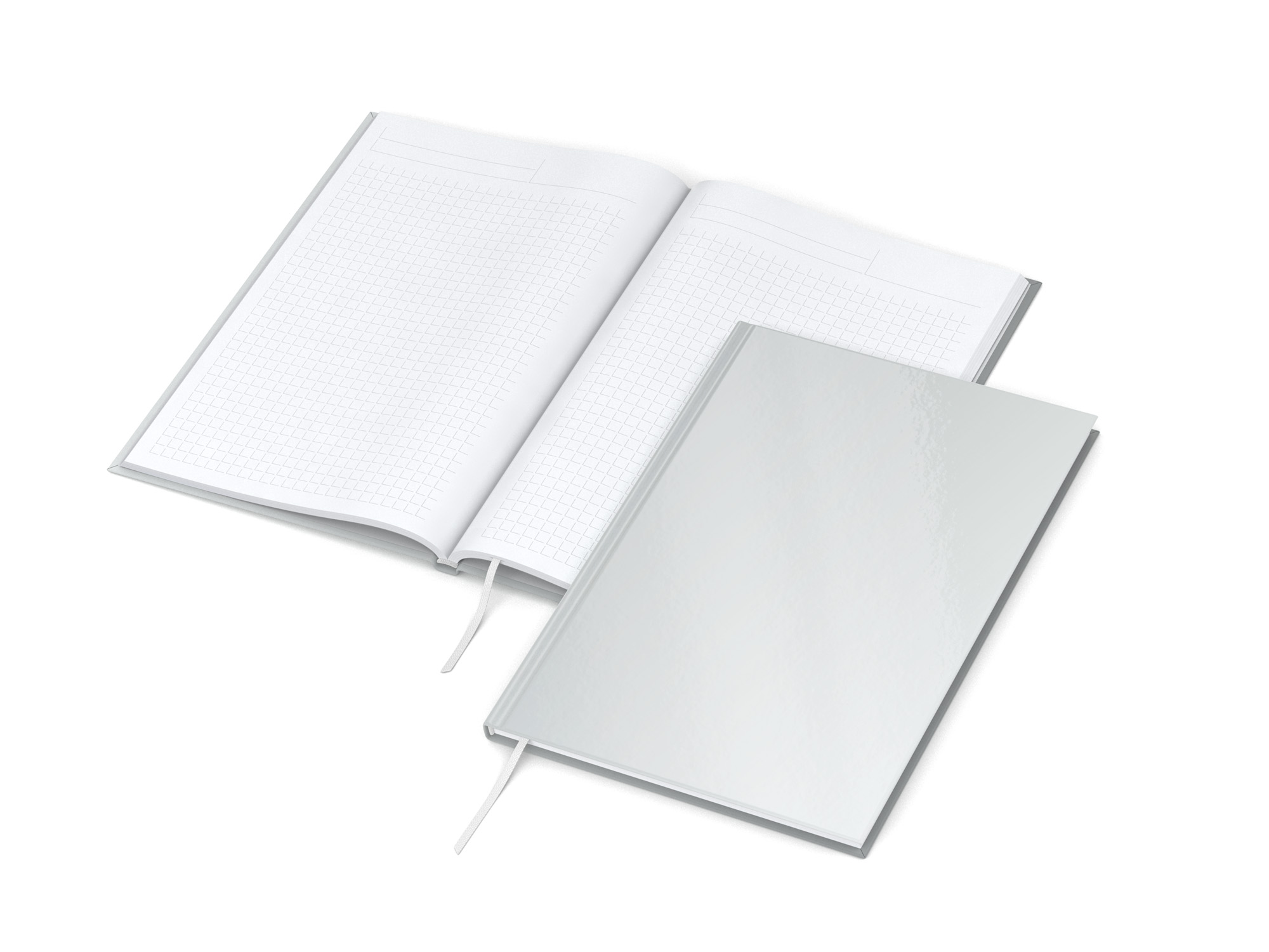 Umfang: 128 Seiten; Verarbeitung: Hardcover mit unwattierter Buchdecke; Lesezeichen; Kapitalband; gerader Rücken; Ausstattung: Notizseiten mit Winkelkaro; Mikroperforation; Einband: Cover-Star gloss-individuell (auf Wunsch matt-individuell, ohne Mehrpreis); Druck: 4C-Quality Digital inklusive; Verpackung: Wellpapp-Versandtasche weiß:; Nr. 23 — 285 x 200 mm; Werbefläche: Kompletter Einband;