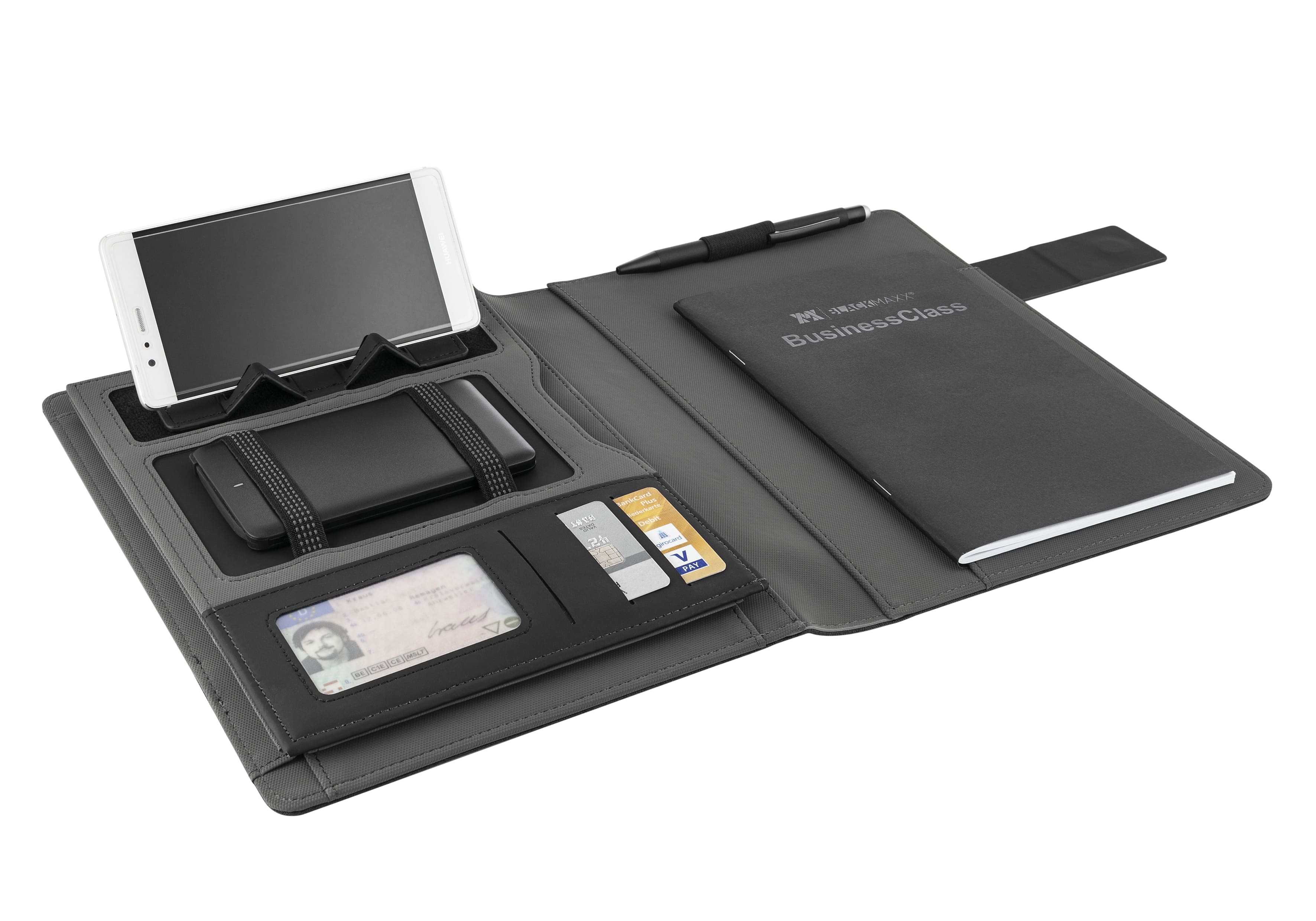 Kompakte A5 Schreibmappe für den Businessalltag mit wireless ChargingPad fürs Telefon und einer Halterung für die eigene Powerbank. 5Watt wireless Pad, Security Chip, DIN A 5 Format, VPE 20. USB Anschluss, Handy-Aufsteller, diverse Steckfächer, A5 Booklet, Designkarton