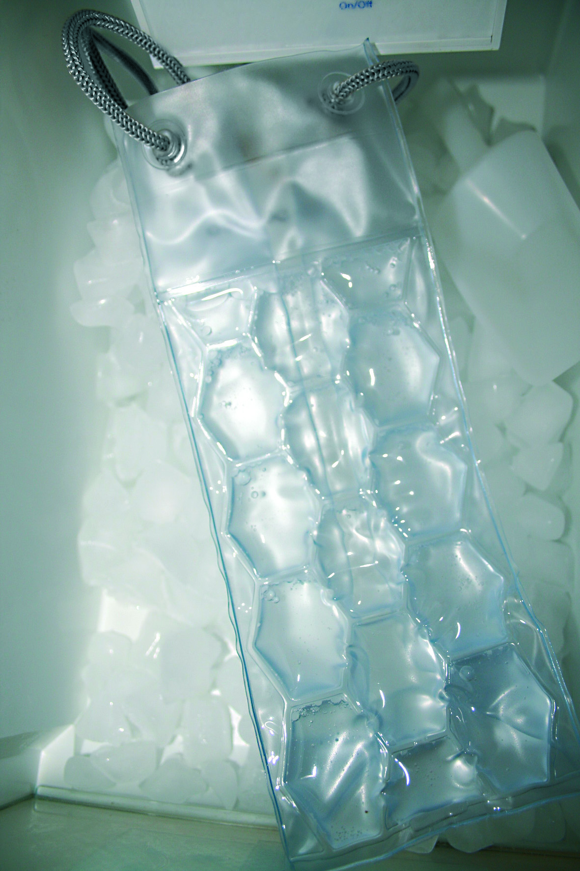 Geschenktüte für z.B. Wein und gleichzeitig Flaschenkühler nach 1 h Lagerung im Gefrierfach. Flüssigkeit ungiftig, VPE 50. Bändel (abnehmbar)