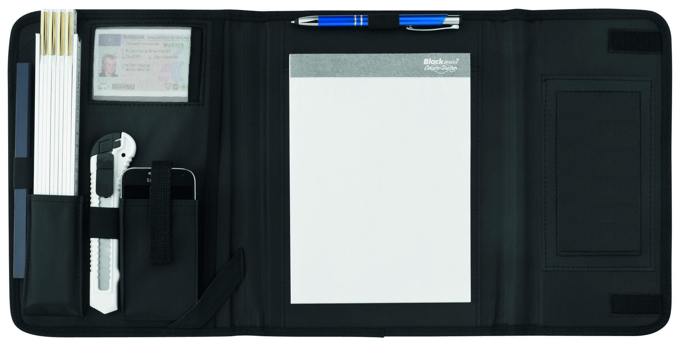 Praktische Handwerkermappe mit qualitativer Ausstattung und großer Werbefläche. 50 Blatt, VPE 20. Schreibblock, Zimmermannsbleistift, Zollstock, Cutter, Stifthalter, viele Fächer, Designkarton
