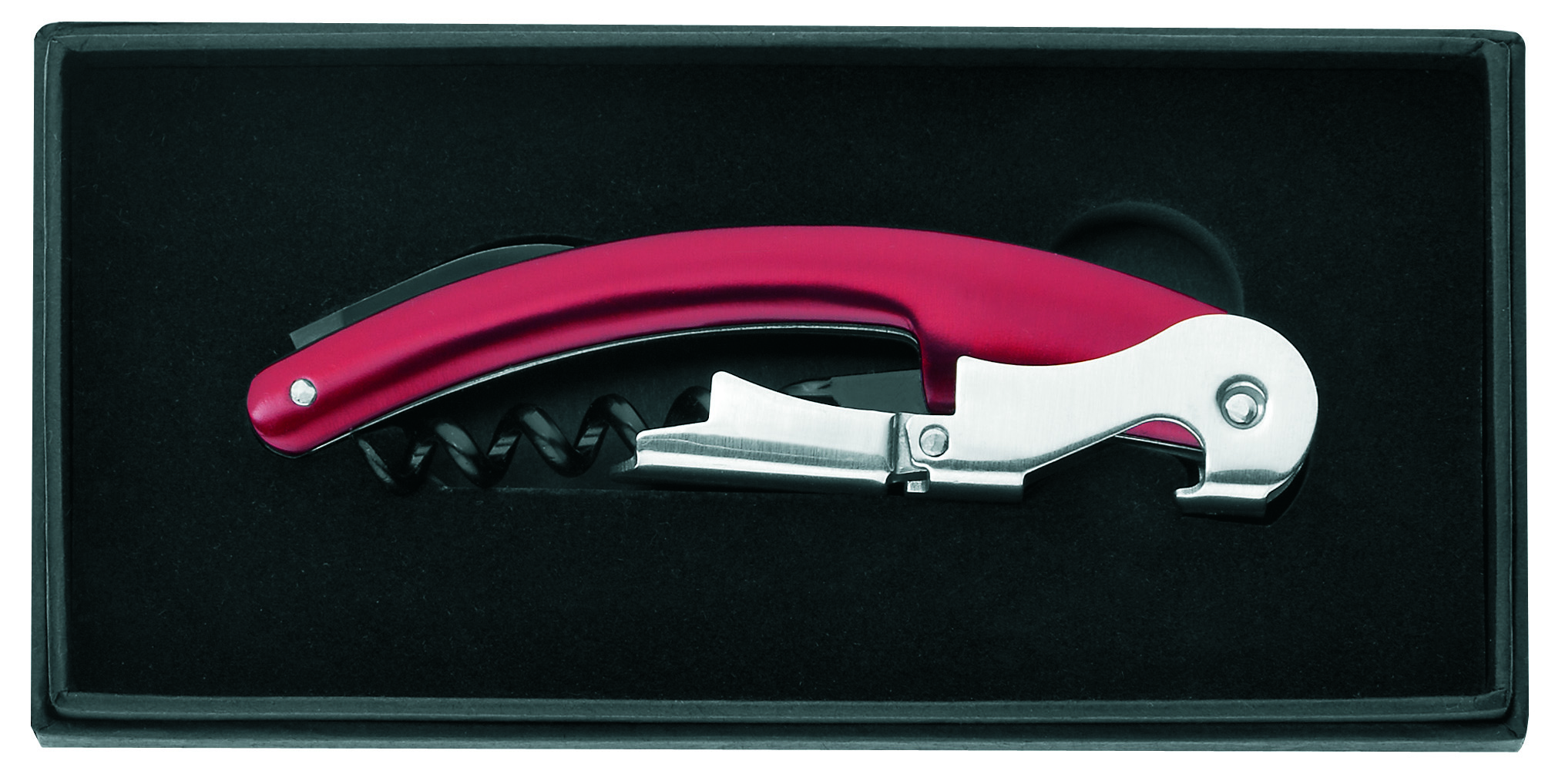 Klassisch elegantes Sommeliermesser mit Anti-Haft-Korkenzieher, EasyOpen2Step-Mechanismus & abgerundeten Edelstahlgriffen für den komfortablen Einsatz, im Designkarton.