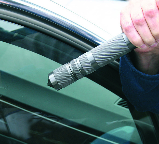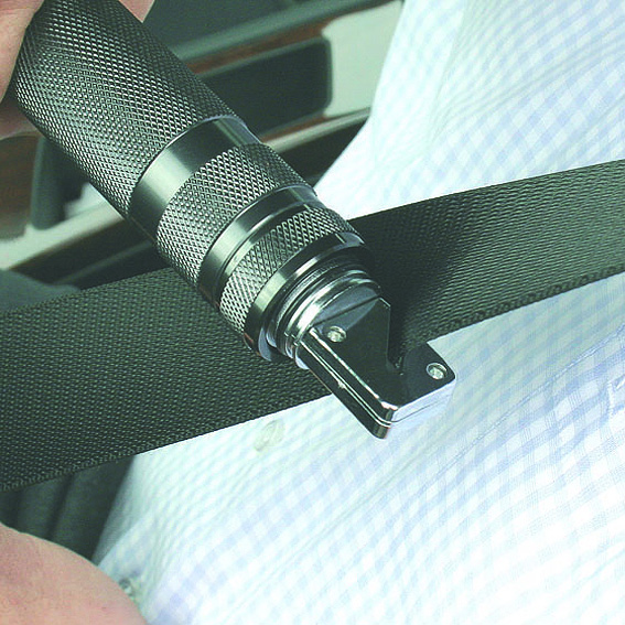Taschenlampe mit 9 LED und separat zu schaltender Warn-LED, außerdem mit Gurtcutter und Nothammer. Spritzwasser- und überspannungsgeschützt, VPE 40. Nothammer, Gurtcutter, Gürteletui, 3 AAA Batterien, Designkarton