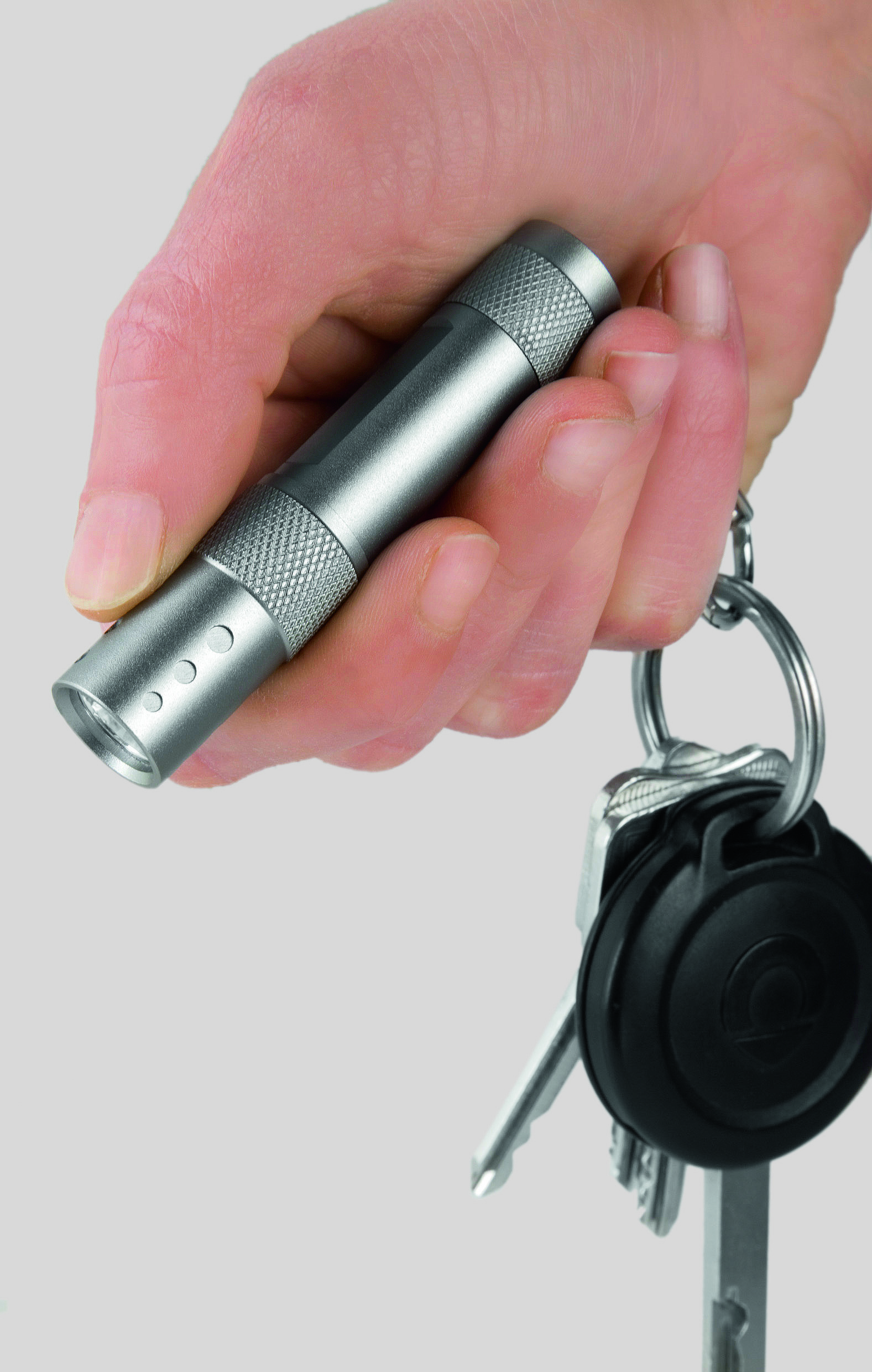 Robuste, handliche Schlüsselanhängerleuchte mit einer Hochleistungs-LED. 0,5Watt, Spritzwasser- und überspannungsgeschützt, VPE 100. Schlüsselkarabiner, 1 AAA Batterie, in Metallschatulle