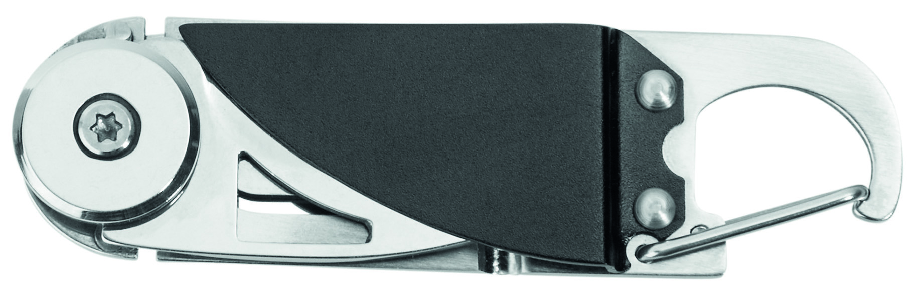 Mini-Taschenmesser mit herausklappbarer Schneidklinge, Kapselheber und Dosenöffner. VPE 240. Karabiner, Designkarton