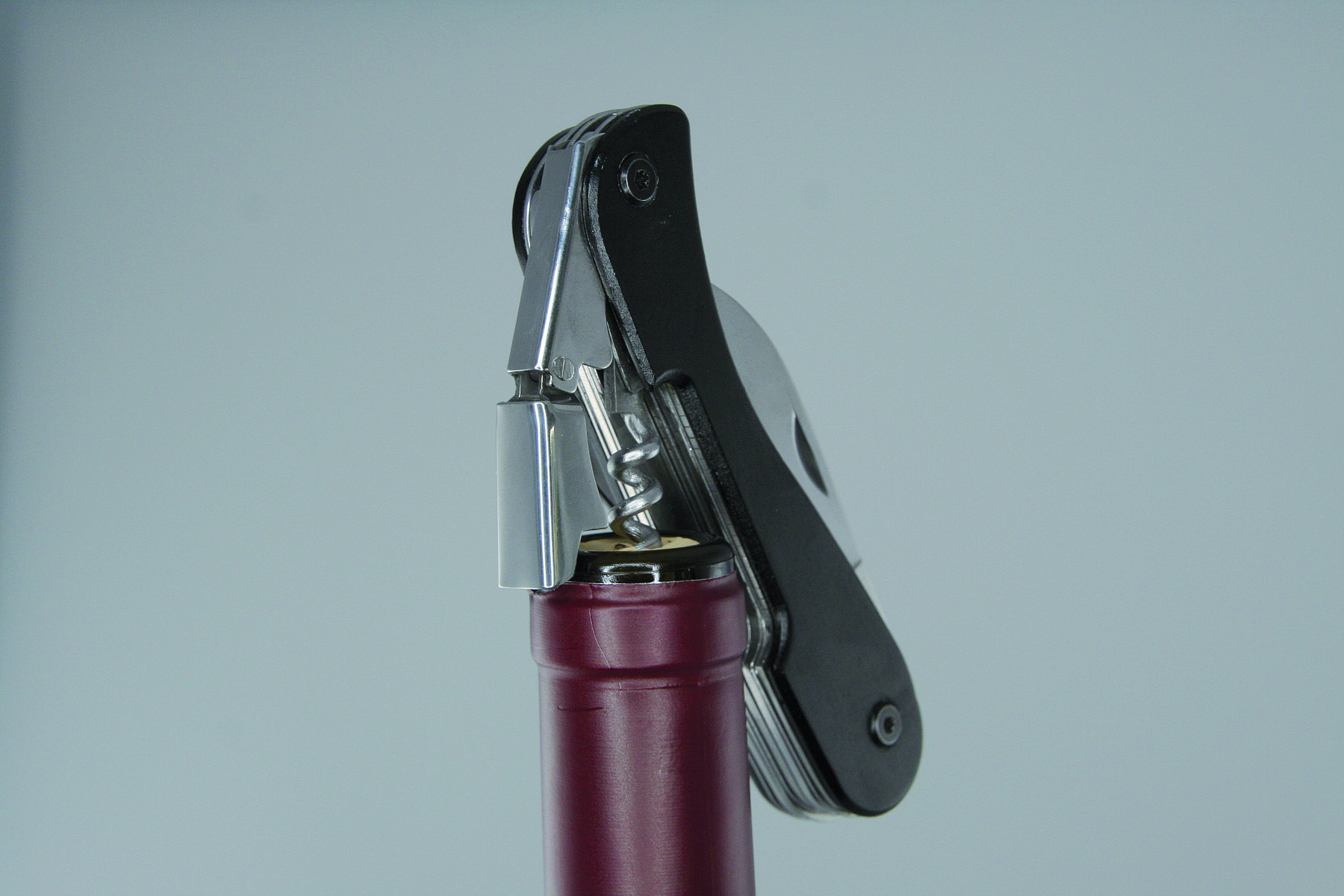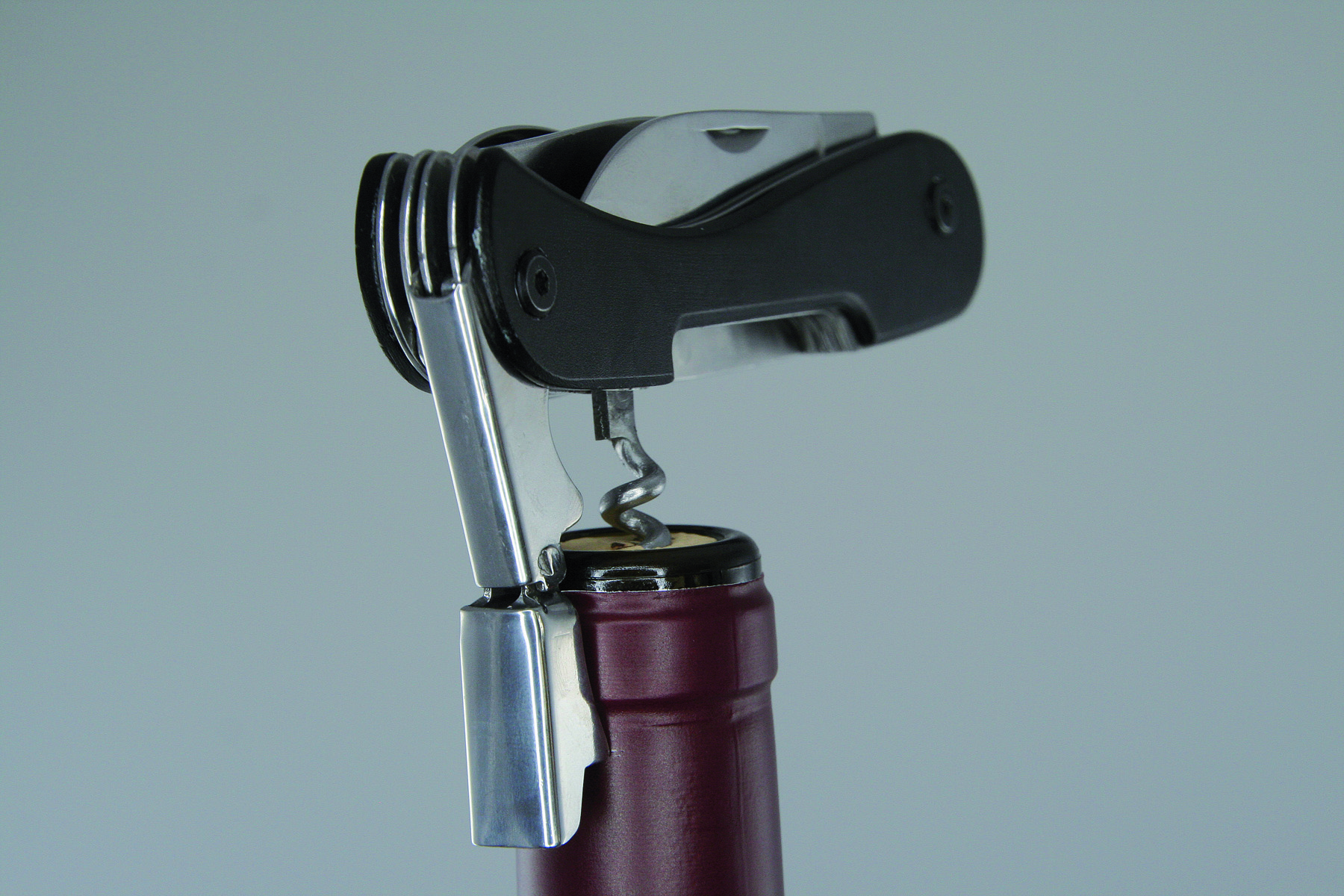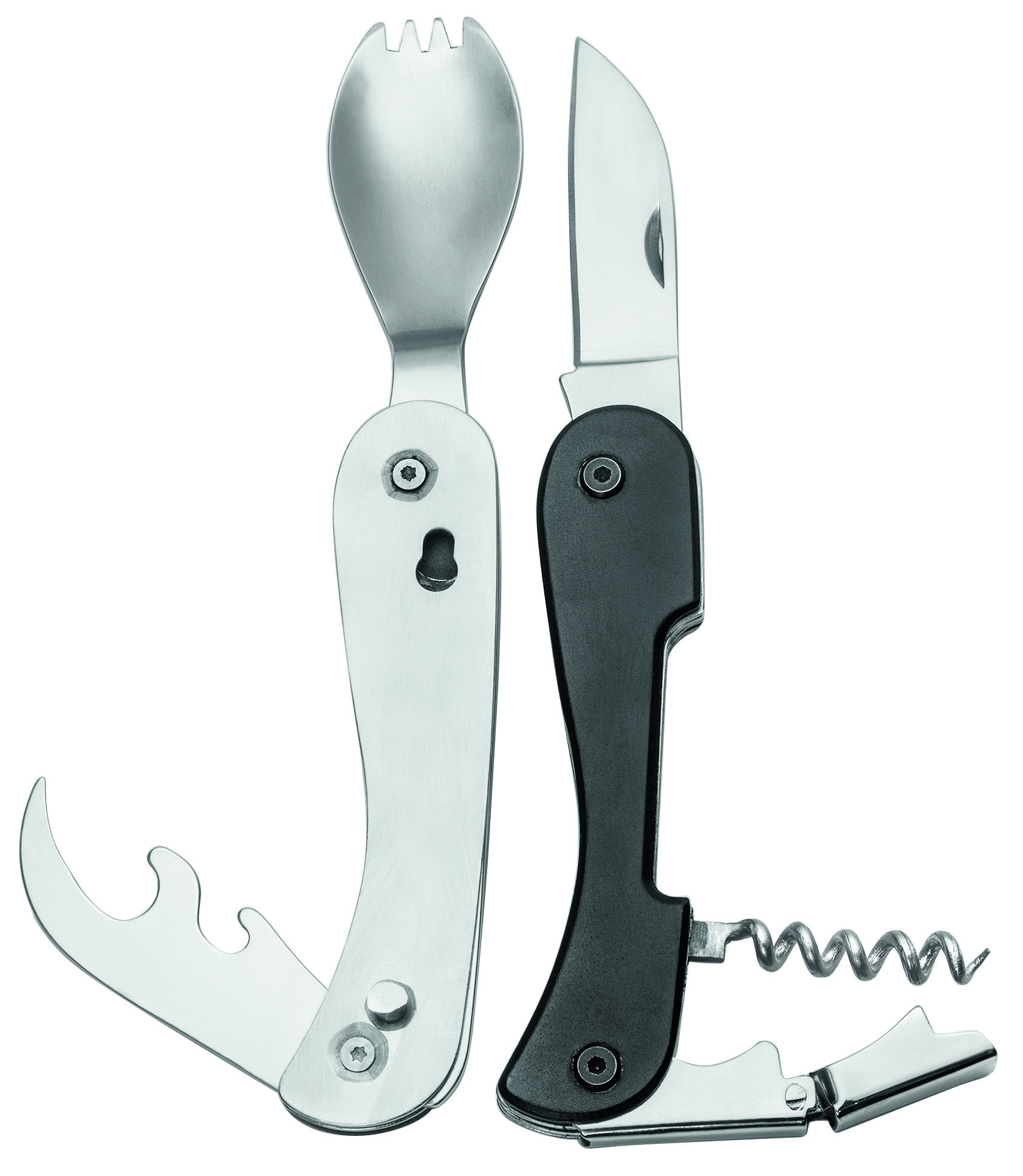 Outdoormesser mit teilbarer Göffel-/Messer-Kombination, Profi-Korkenzieher, Dosenöffner und Kapselheber. EasyOpen2Step-Mechanismus, wertige Metallgriffschalen, VPE 50. Designkarton