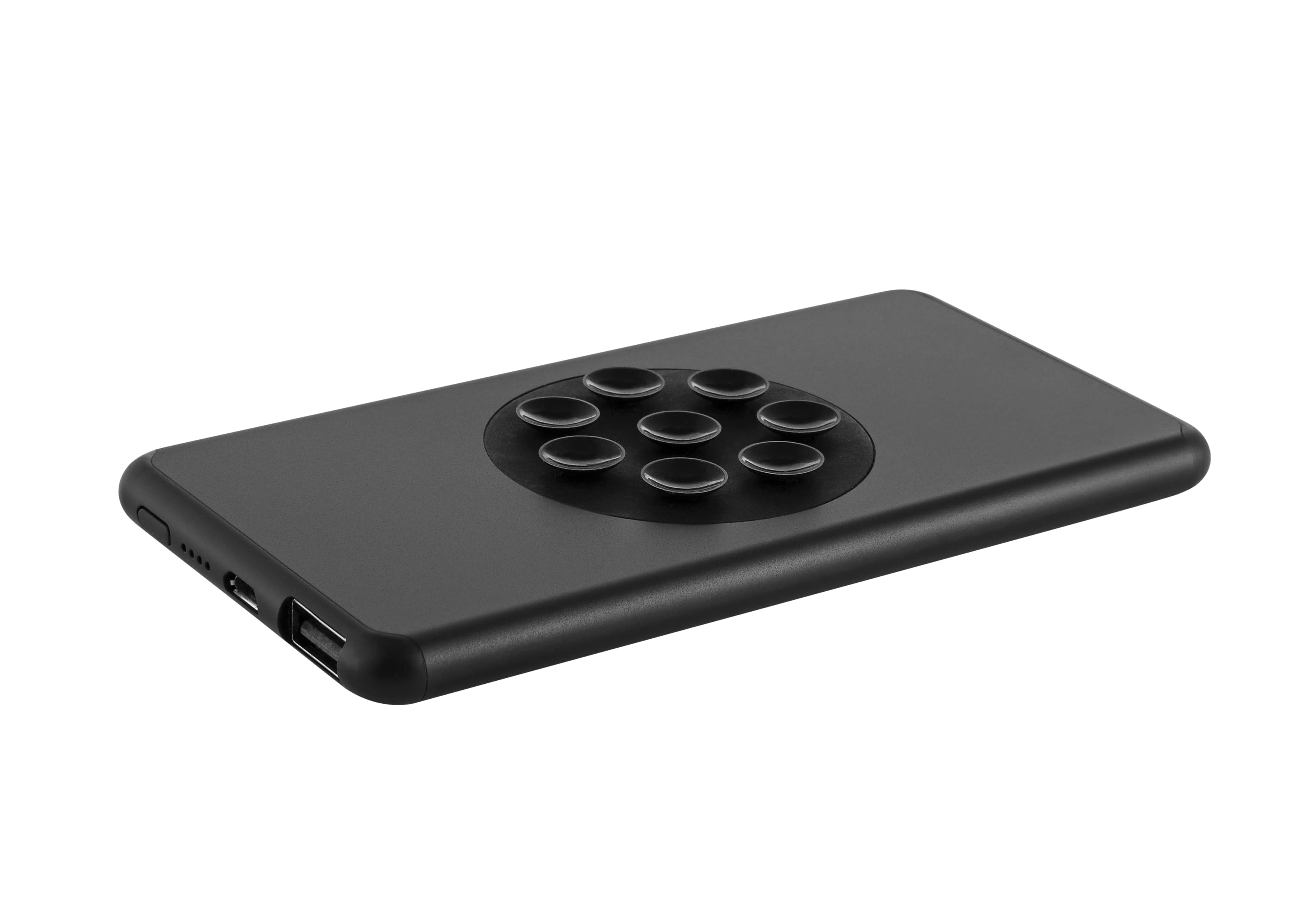 Wireless Powerbank für kabelloses wie auch kabelgebundenes Laden mit Saug-Pad zum sicheren Fixieren des Handys unterwegs. 5Watt, 5.000mAh Lithium-Polymer-Akku, Security Chip, VPE 100. Saug-Pad, USB-Kabel, USB und Micro-USB Port, Ladestandsanzeige, Designkarton