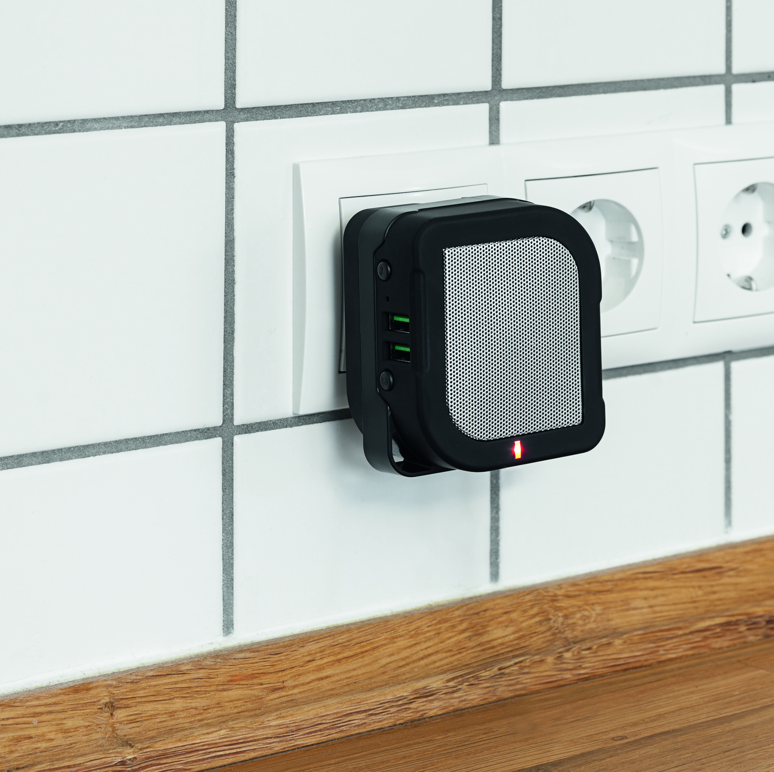 Allrounder: Bluetooth® Lautsprecher für die Steckdose, USB Adapter und Powerbank mit Reisesteckern. Für über 120 Länder, Lithium-Ionen-Akku, Security Chip, VPE 50. 2 USB Ports, Reisesteckersatz, Designkarton