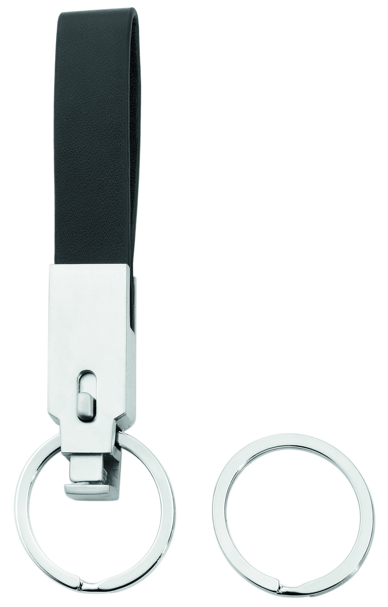 Komfortabler Schlüsselanhänger mit 2 Schlüsselringen, einer davon einfach per Clip abzunehmen. VPE 200. 2x 35mm Schlüsselringe, Designkarton