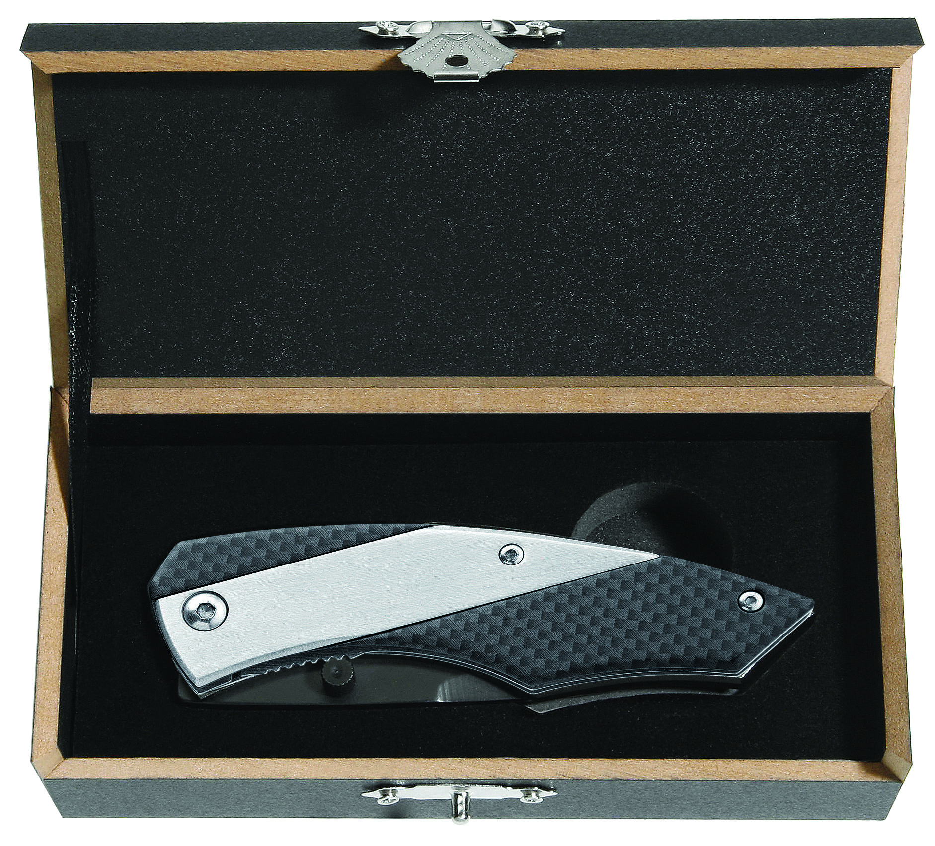 Profi- und Freizeitmesser aus Edelstahl im Carbon-Look mit antihaftbeschichteter Klinge. Feststellbare Klinge, Sicherheitsbügel, VPE 60. Gürtelclip, Holzschatulle, Designkarton