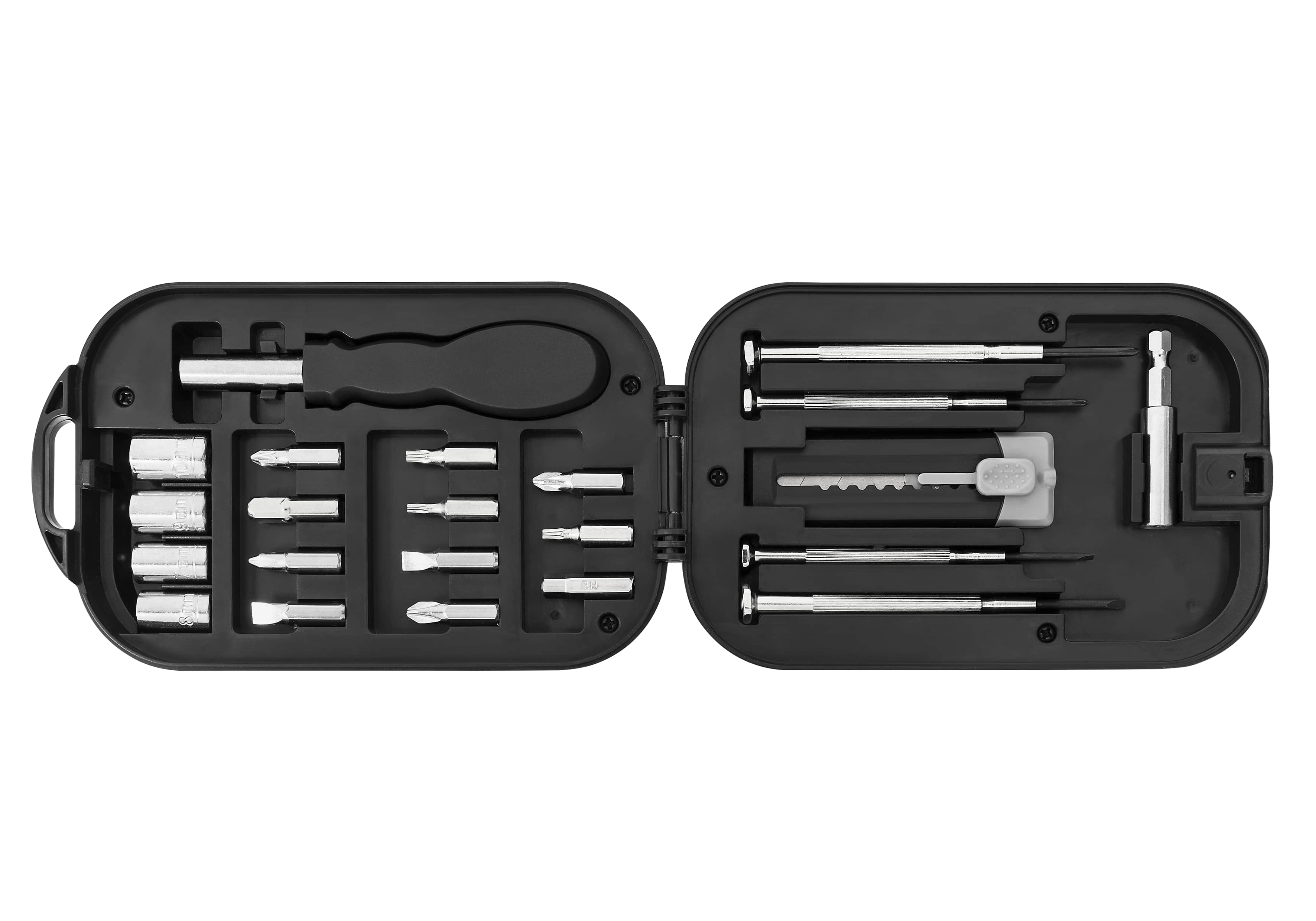 Kompakter Design-Werkzeugtrolly für Zuhause mit kompletter Werkzeugsammlung von robust guter Do it yourself Qualität. 23-teilig, robuster ABS Trolley, Werkzeuge aus gehärtetem Stahl mit ca. 48 Rockwell, VPE 40. Bitschraubendreher, 11 Bits, Bithalteverlängerung, 4 Schraubnüsse, 4 Schraubendreher (Kreuz/Schlitz), Cuttermesser, Designkarton