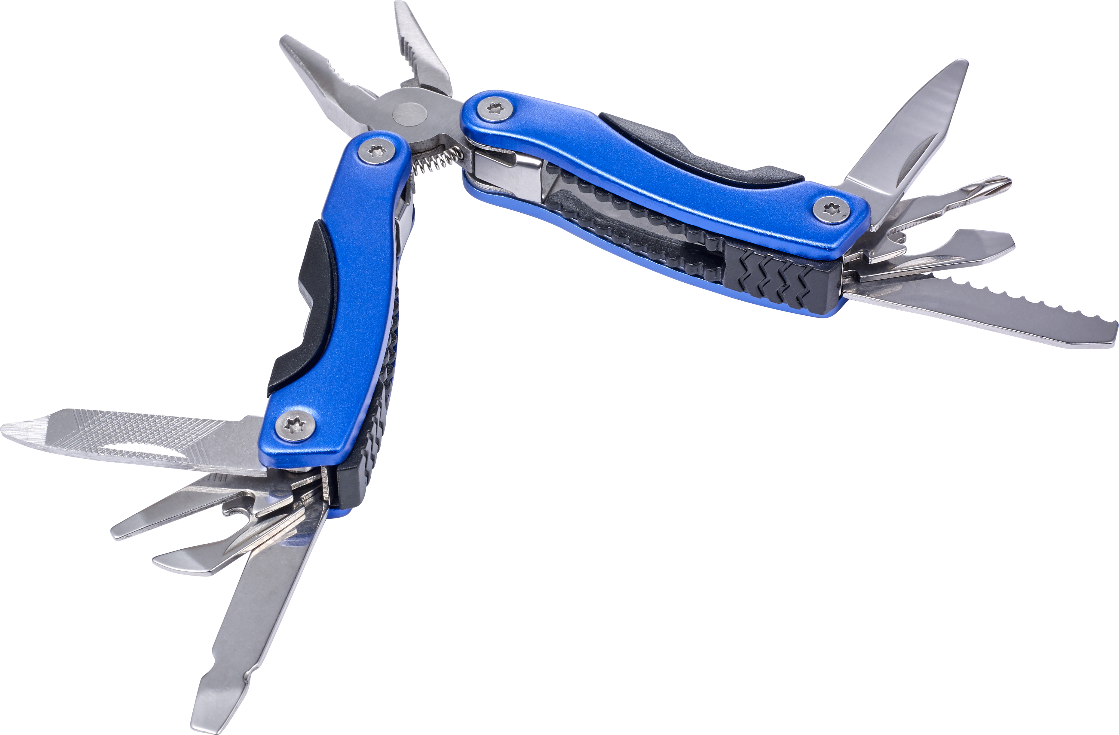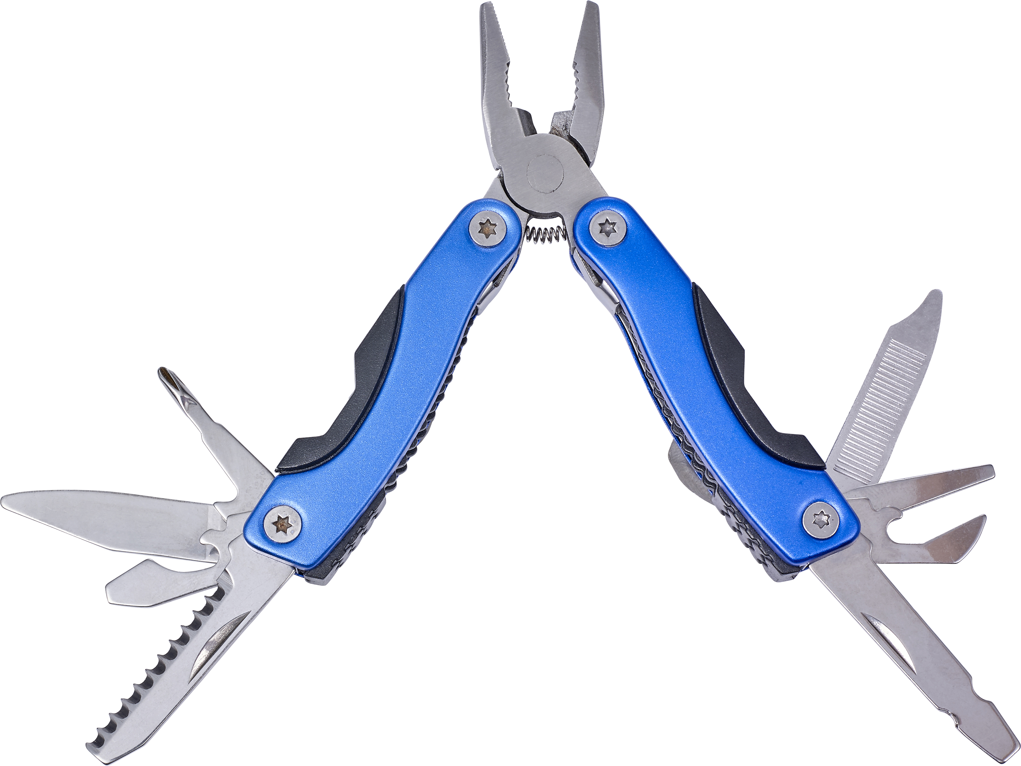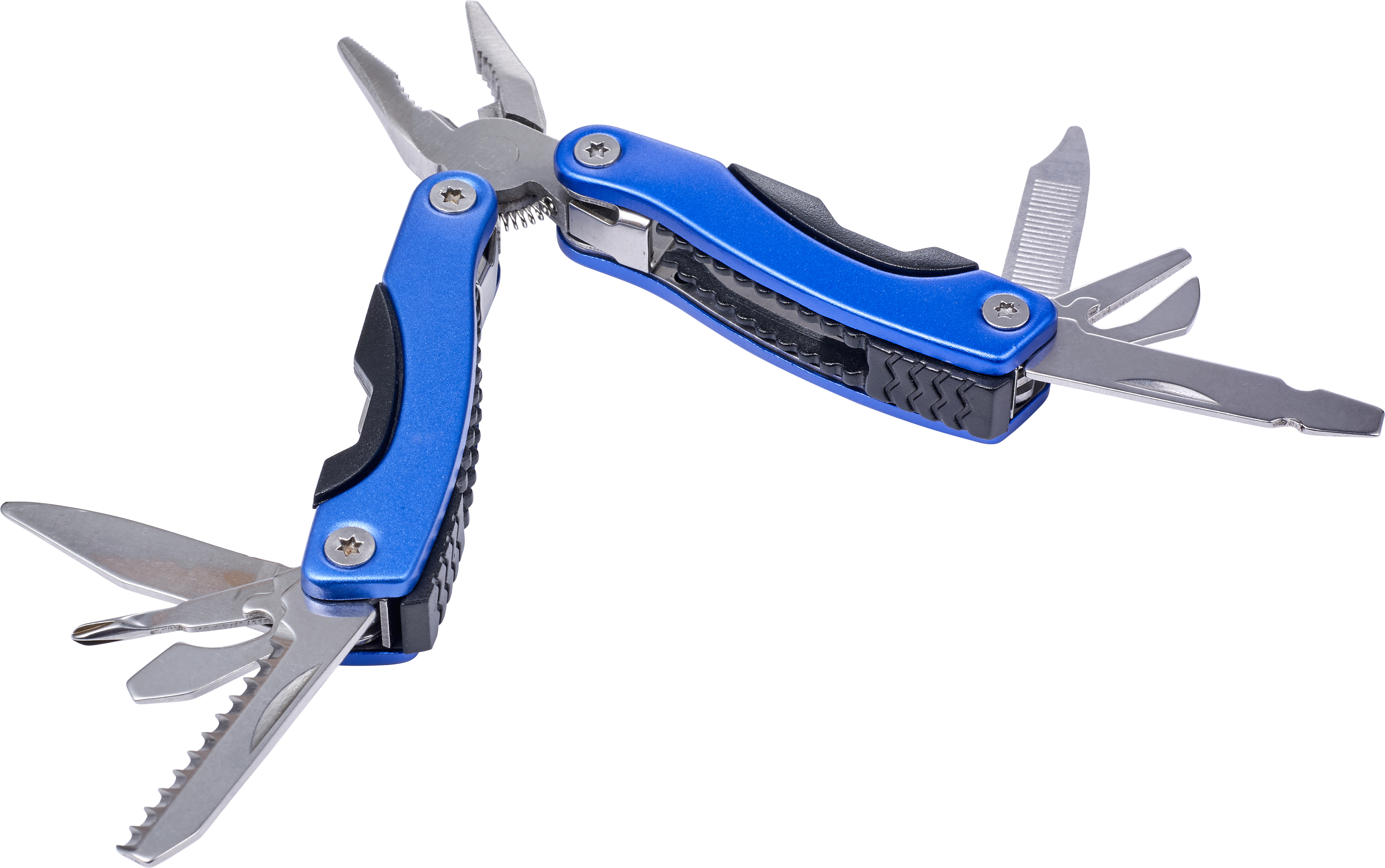 Multifunktionswerkzeug, welches beim Öffnen zu einer Zange wird. In dem Werkzeug sind verschiedene Werkzeuge integriert: Kreuz- und Schlitzschraubenzieher, Nussknacker, Dosen- und Flaschenöffner.