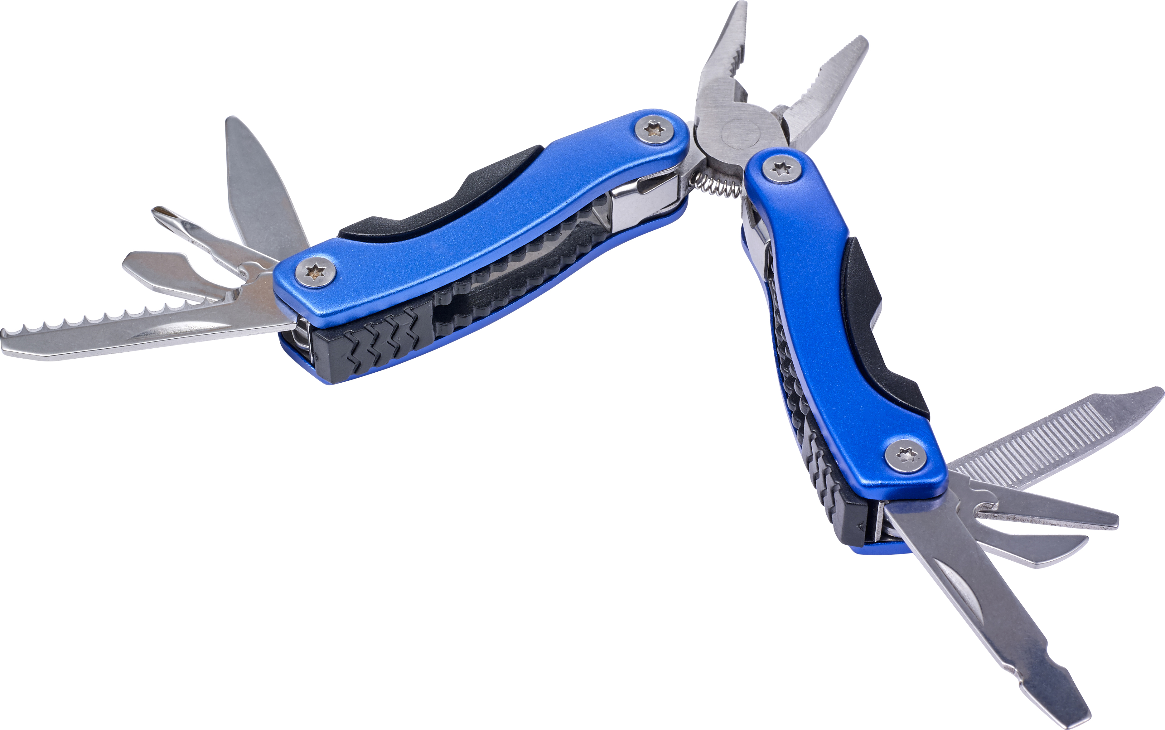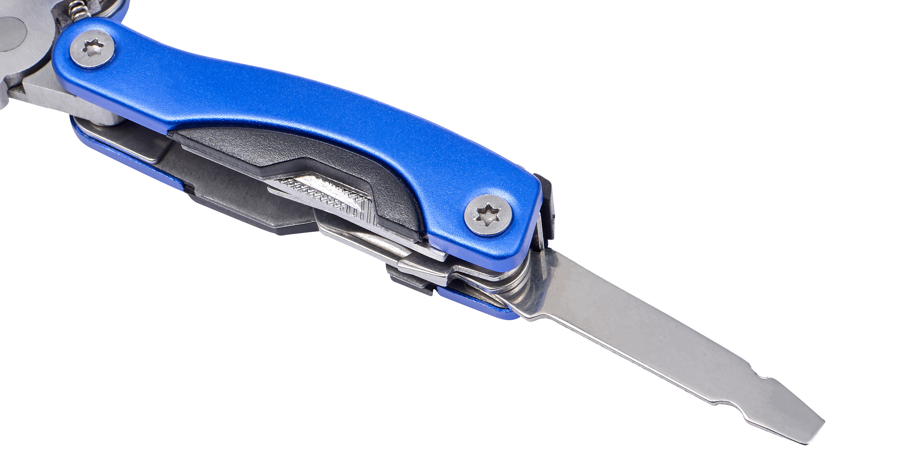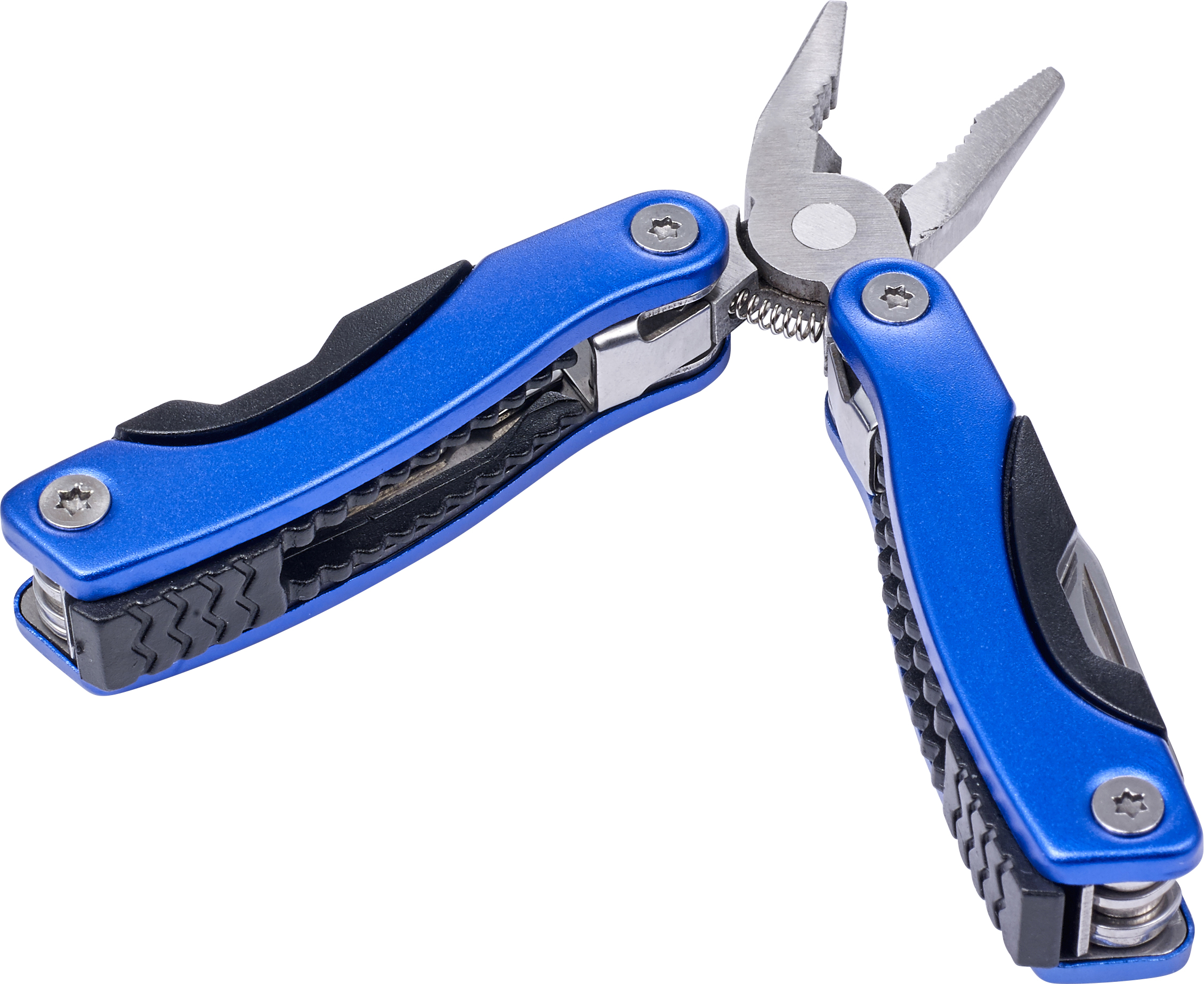 Multifunktionswerkzeug, welches beim Öffnen zu einer Zange wird. In dem Werkzeug sind verschiedene Werkzeuge integriert: Kreuz- und Schlitzschraubenzieher, Nussknacker, Dosen- und Flaschenöffner.