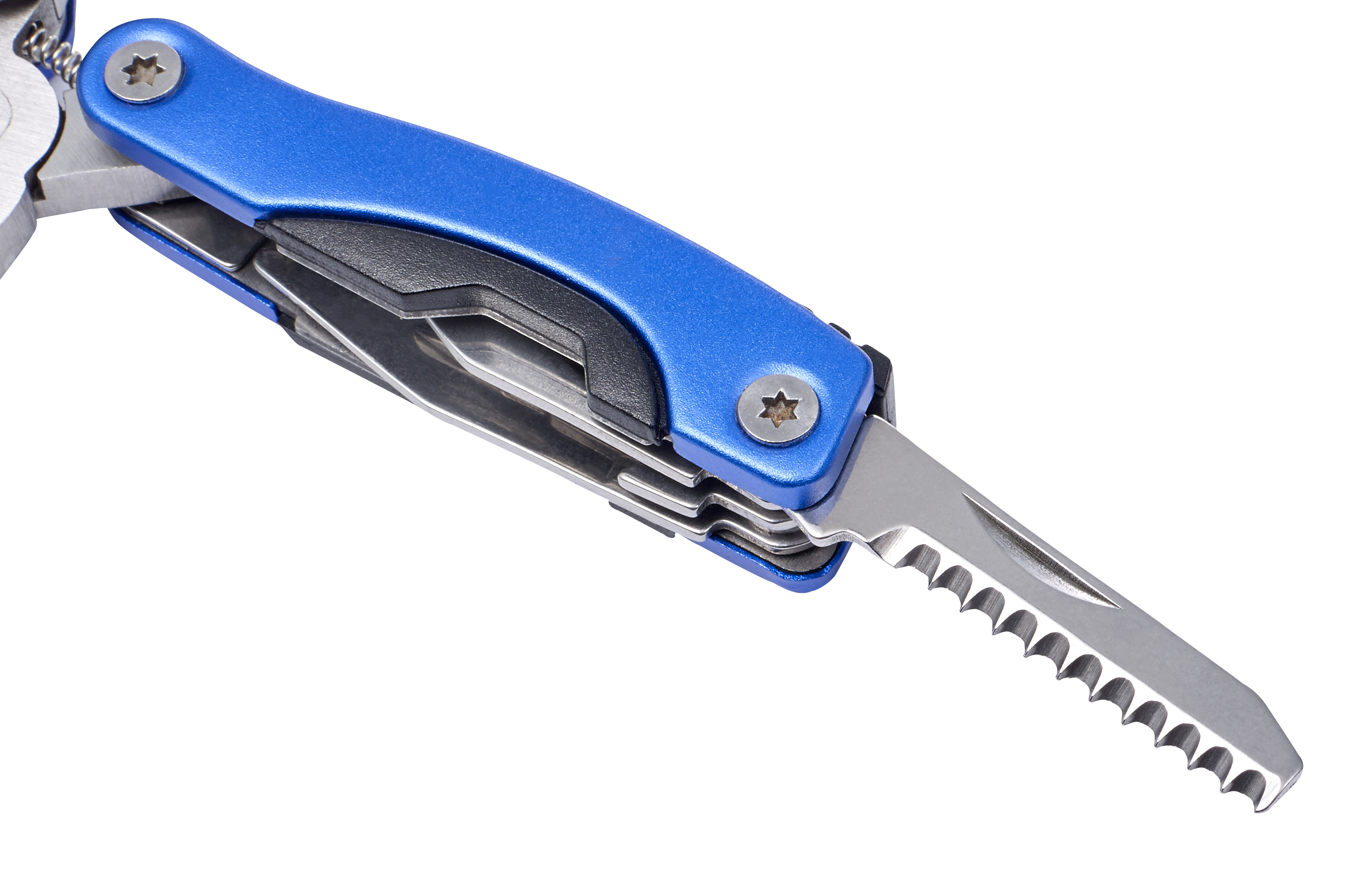 Multifunktionswerkzeug SMALL PLIERS : mit gefederter, ausklappbarer Kombizange, in den Aluminium beschichteten Griffen integrierte Edelstahl-Werkzeuge: Säge, Feile, Dosenöffner und Kapselheber, Messerklinge, kleiner und großer Schraubendreher, Kreuzschlitzschraubendreher, in Nylon-Tasche mit Klettverschluss und Gürtelschlaufe auf der Rückseite