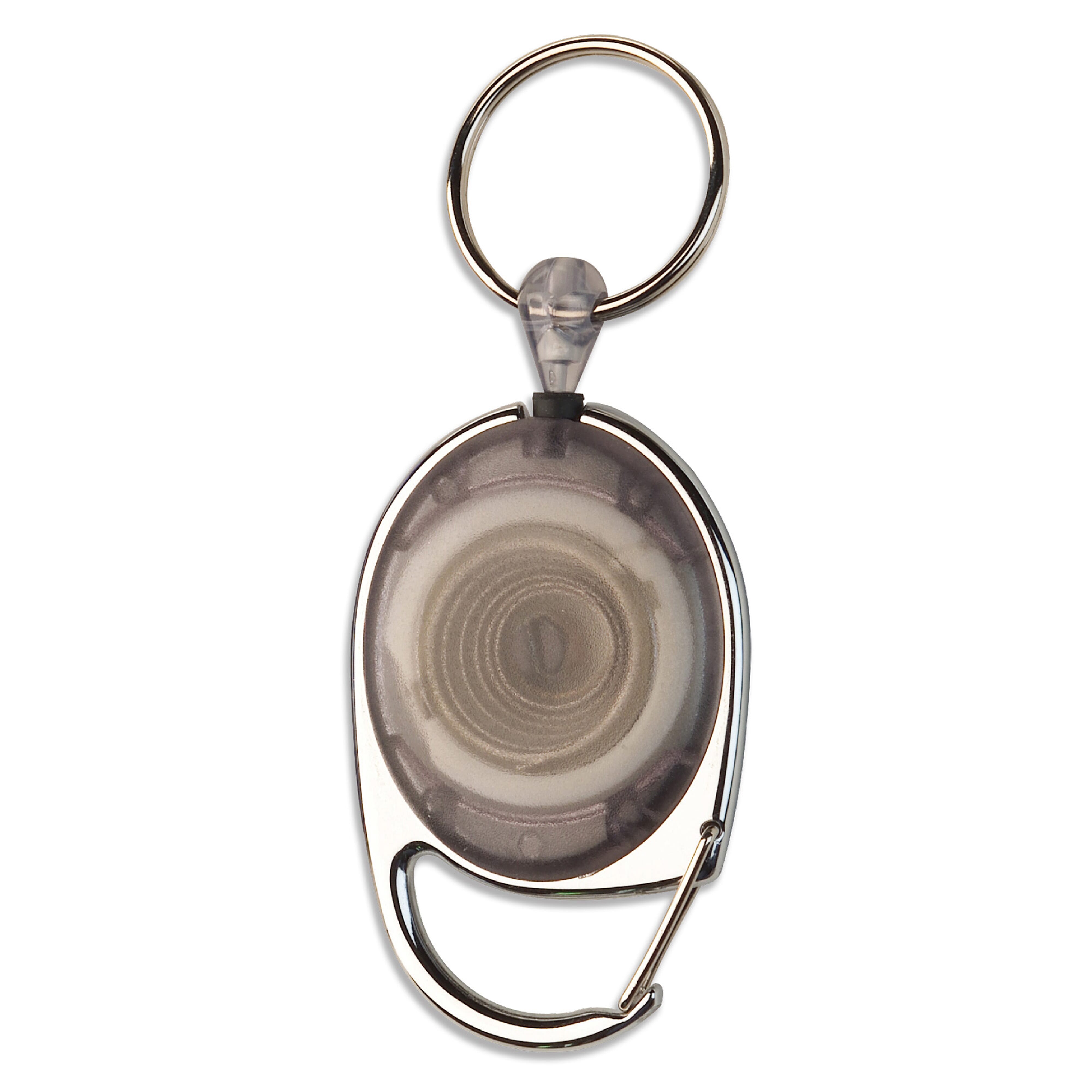 Gefrosteter Namensschildhalter mit Ausziehband (60cm) und Karabinerhaken.