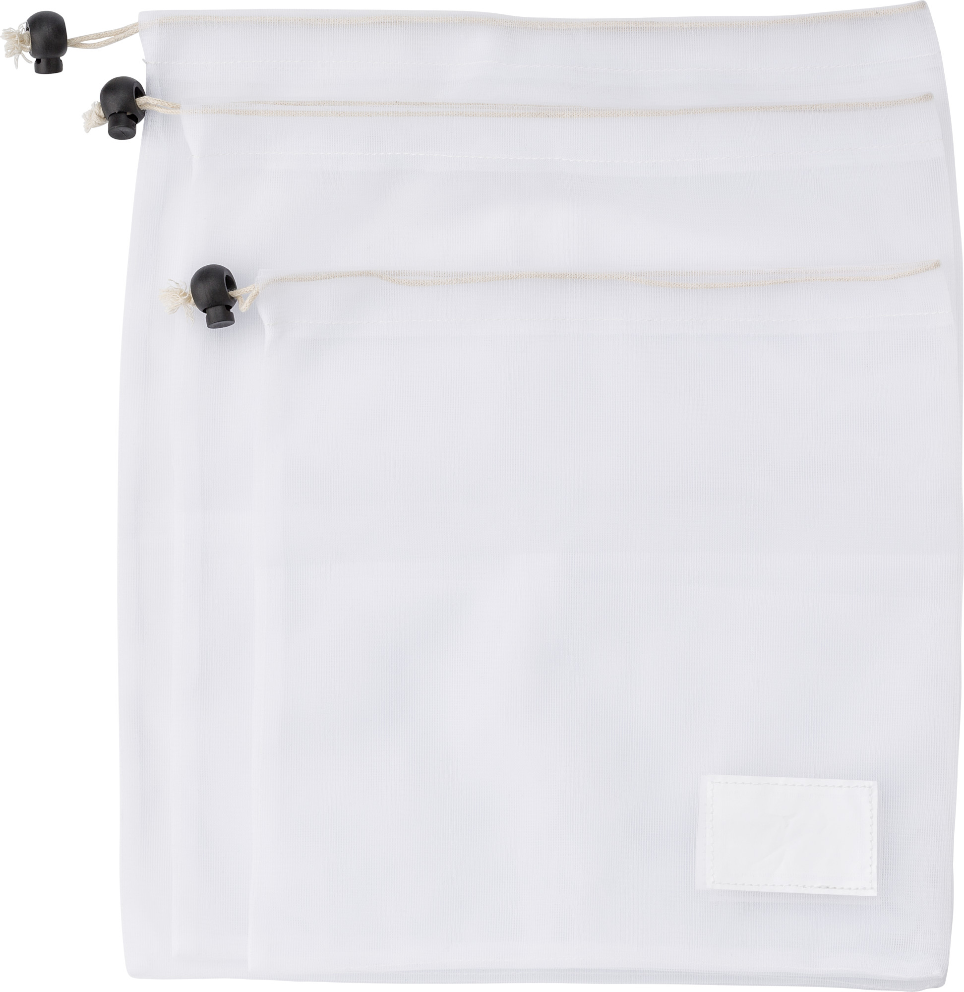 rPET-Netzbeutel im 3er-Set mit drei verschiedenen Größen (35 x 30 cm, 31 x 27,5 cm, 25 x 25 cm). Jeder Beutel wird mit einem Kordelzug geschlossen. Die drei Beutel sind mit einer Papierbanderole gebündelt.