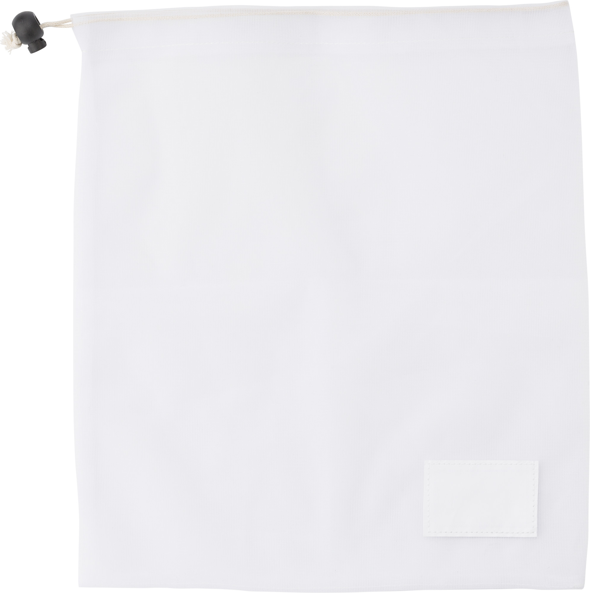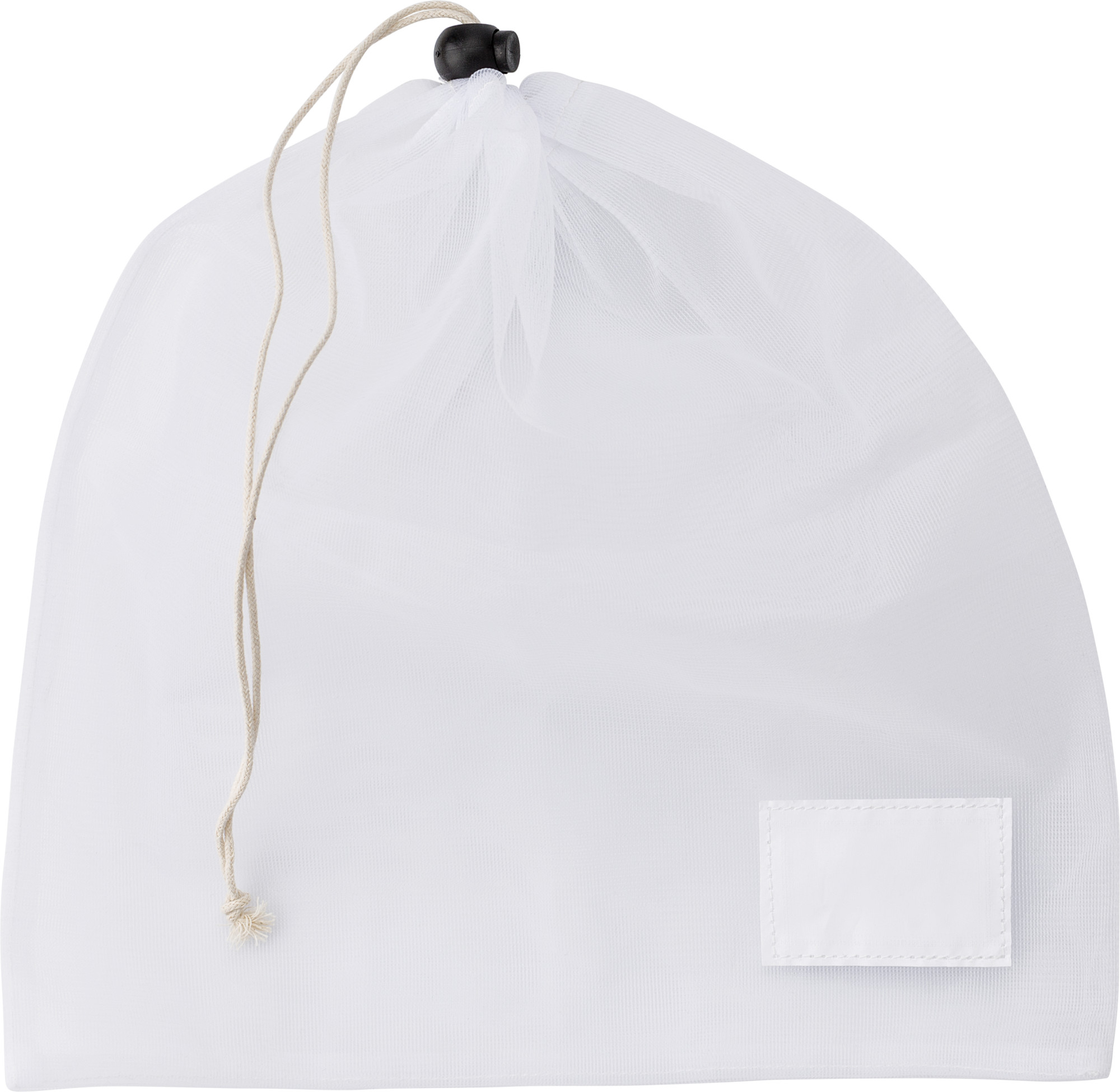 rPET-Netzbeutel mit Kordelzug und Papierbanderole.
