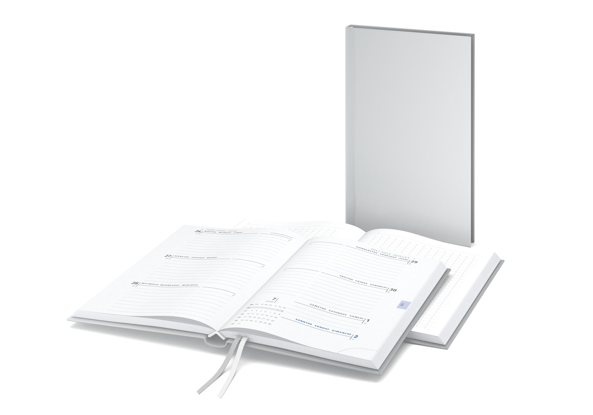 Kalendarium: Note-Hybrid Week:; Deutsch 3sprachig D/GB/F; je Woche 2 Seiten; Umfang: 192 Seiten; Note-Hybrid Week:; 128 Seiten Kalendarium; 64 Seiten Notizen; Verarbeitung: Hardcover mit unwattierter Buchdecke; Eckenperforation; 2 Lesezeichen; Kapitalband; runder Rücken; Ausstattung: Notizseiten mit Winkelkaro und Mikroperforation; Material: Hochweißes Schreibpapier 80 g/m²; Verpackung: Nr. 23 — 285 x 200 mm; Einband: Cover-Star gloss-individuell (auf Wunsch matt-individuell, ohne Mehrpreis); Druck: 4C-Quality Digital inklusive; Werbefläche: Kompletter Einband;