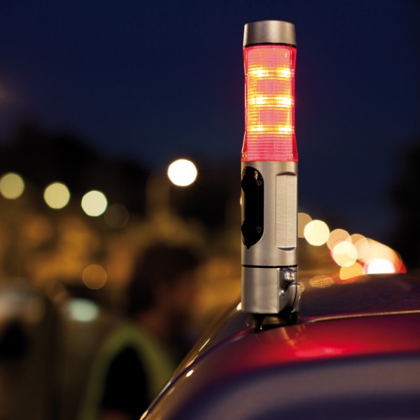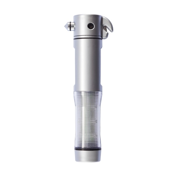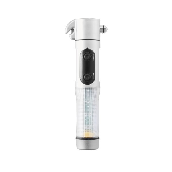 Notfalllampe im silbernen Kunststoffgehäuse, mit 1 weißen LED und 9 roten Alarmlichtern seitlich, Gurtschneider, Fensterhammer und magnetischem Sockel.