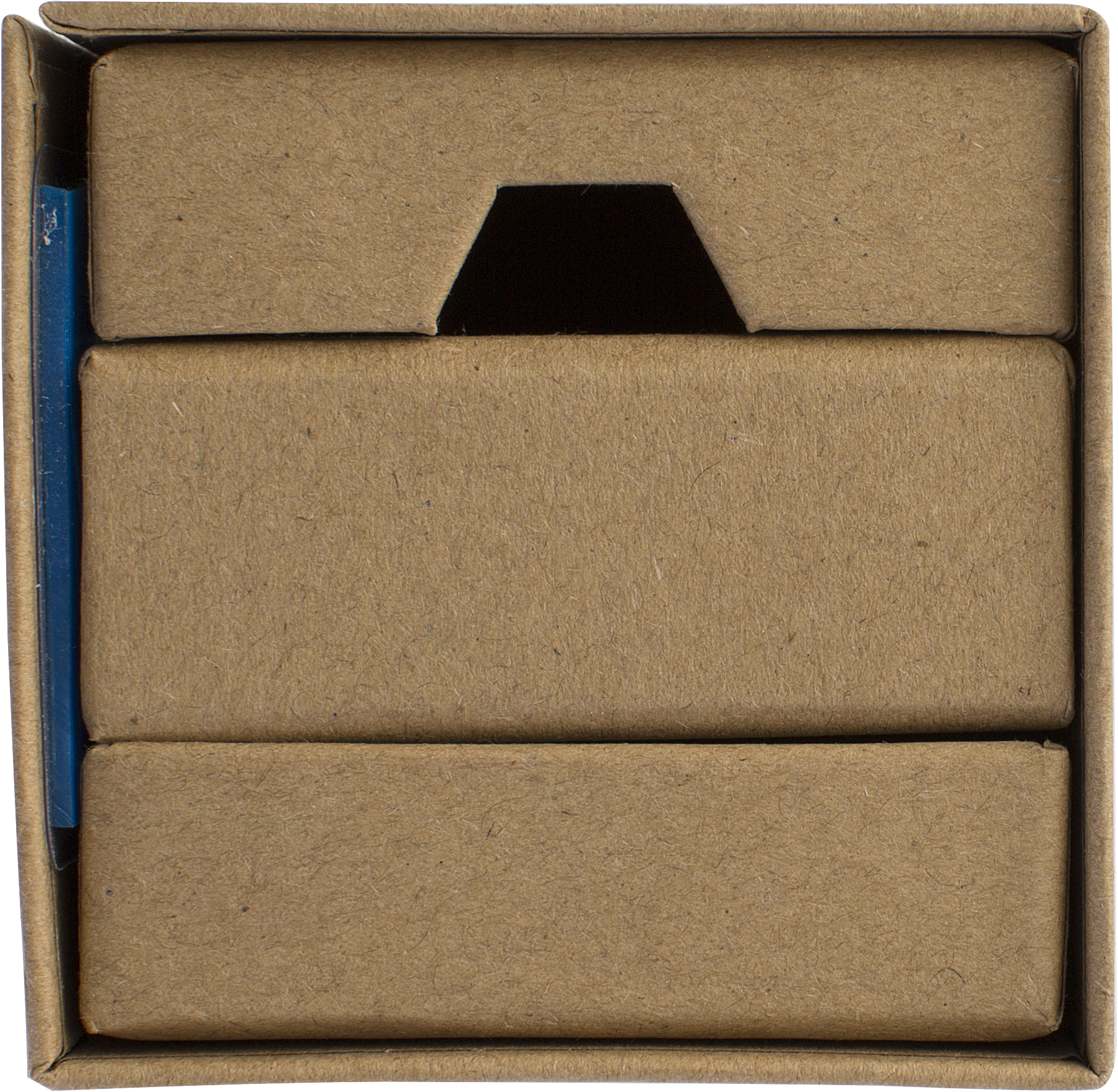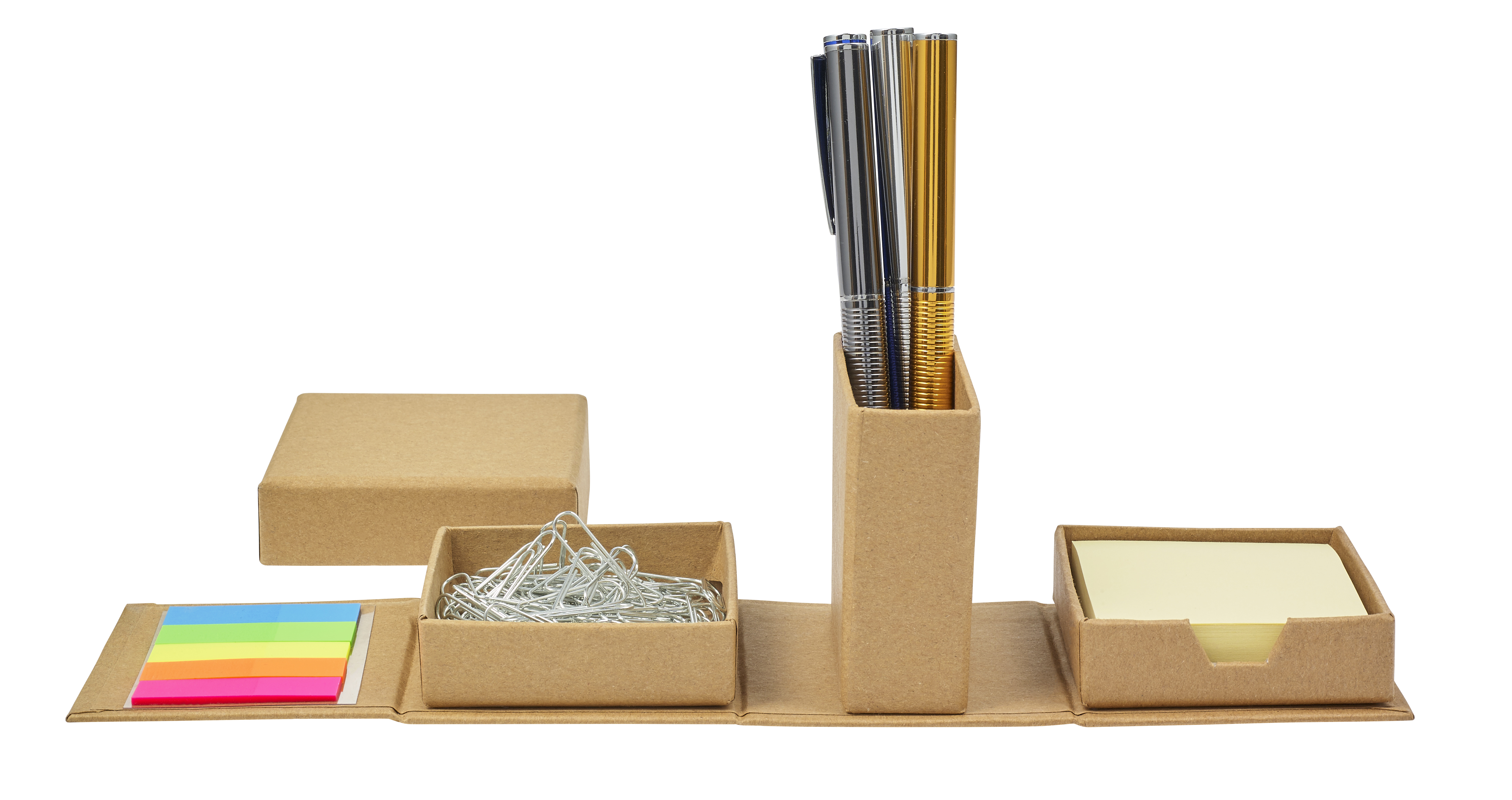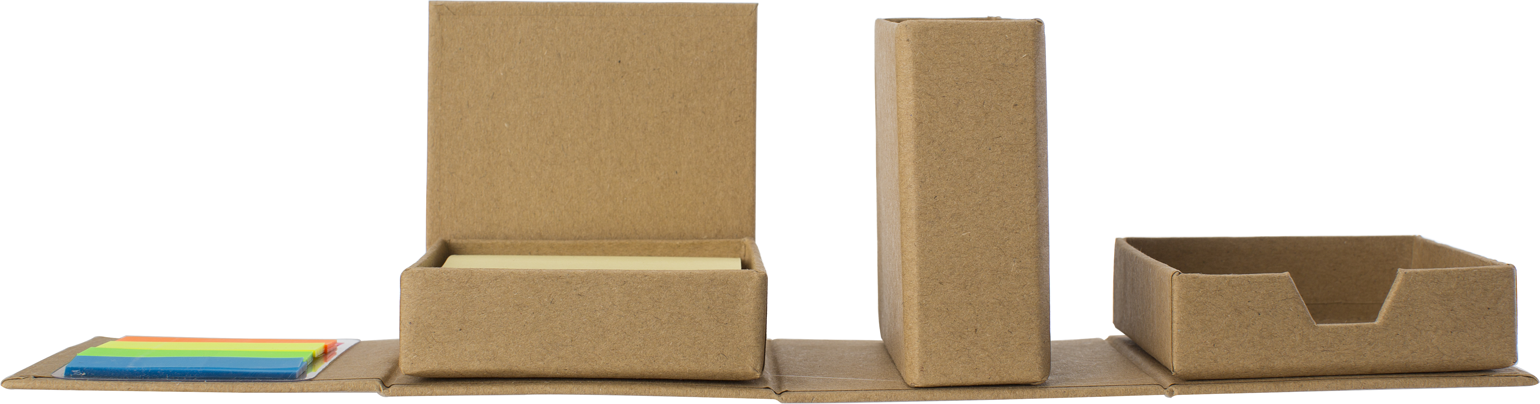 Notizwürfel aus recycelter Pappe, bestehend aus 5x kleinen Haftnotizen (je 25 Blatt) und 1x großen Haftnotizen (80 Blatt), einer Stiftebox und einem Fach für Büroklammern.