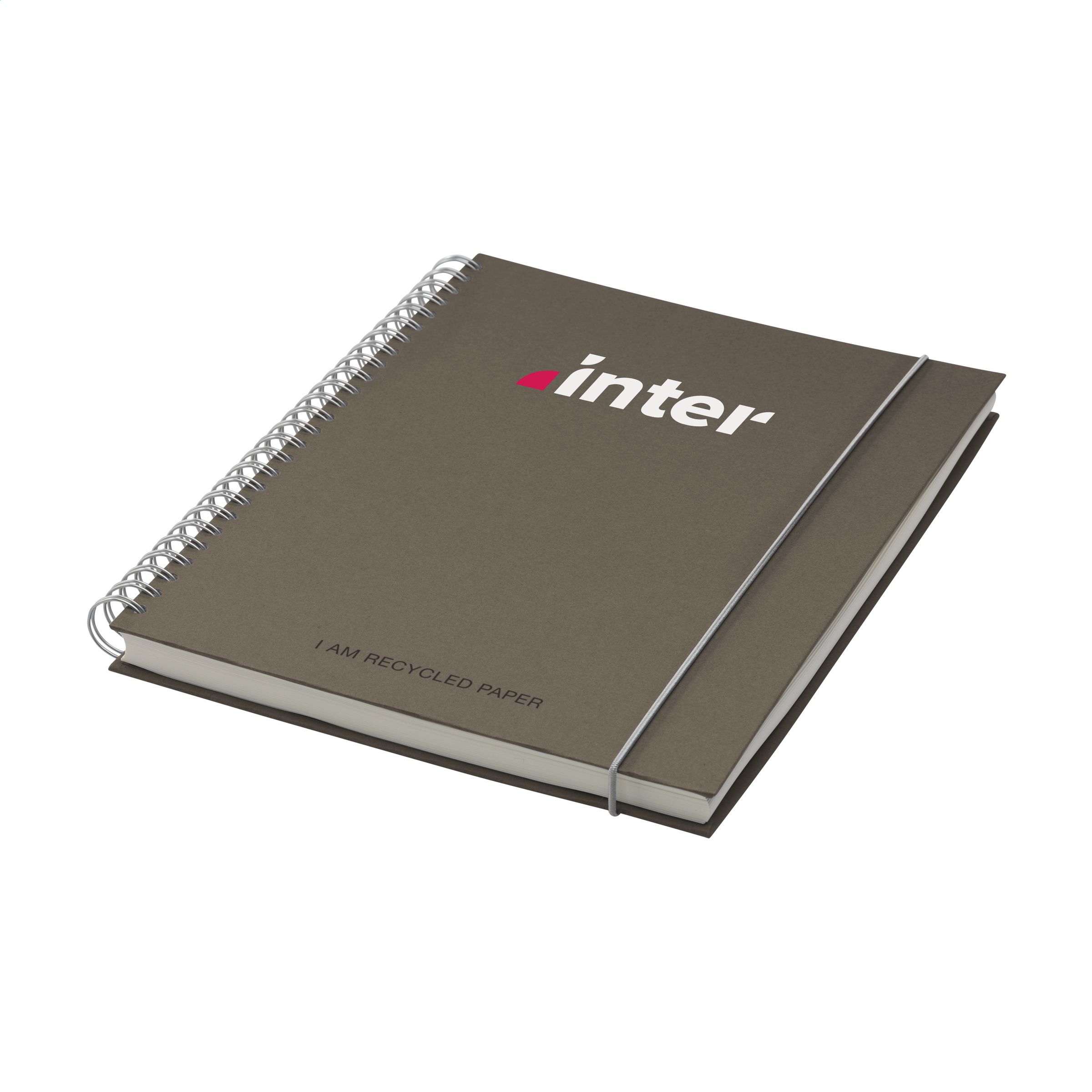 WoW! Notizbuch im A5-Format. Mit 100 Blatt/200 Seiten liniertem Papier (80 g/m²), einer stabilen Wire-O-Bindung und einem Verschlussgummi. Der Hardcover-Einband besteht aus landwirtschaftlichen und organischen Abfällen, z. B. von Tomaten, Paprika, Pflanzen und Zwiebeln. Diese Abfälle werden mit Recyclingpapier aus Europa gemischt. Ein praktisches Notizbuch, um Ideen zu notieren und festzuhalten.