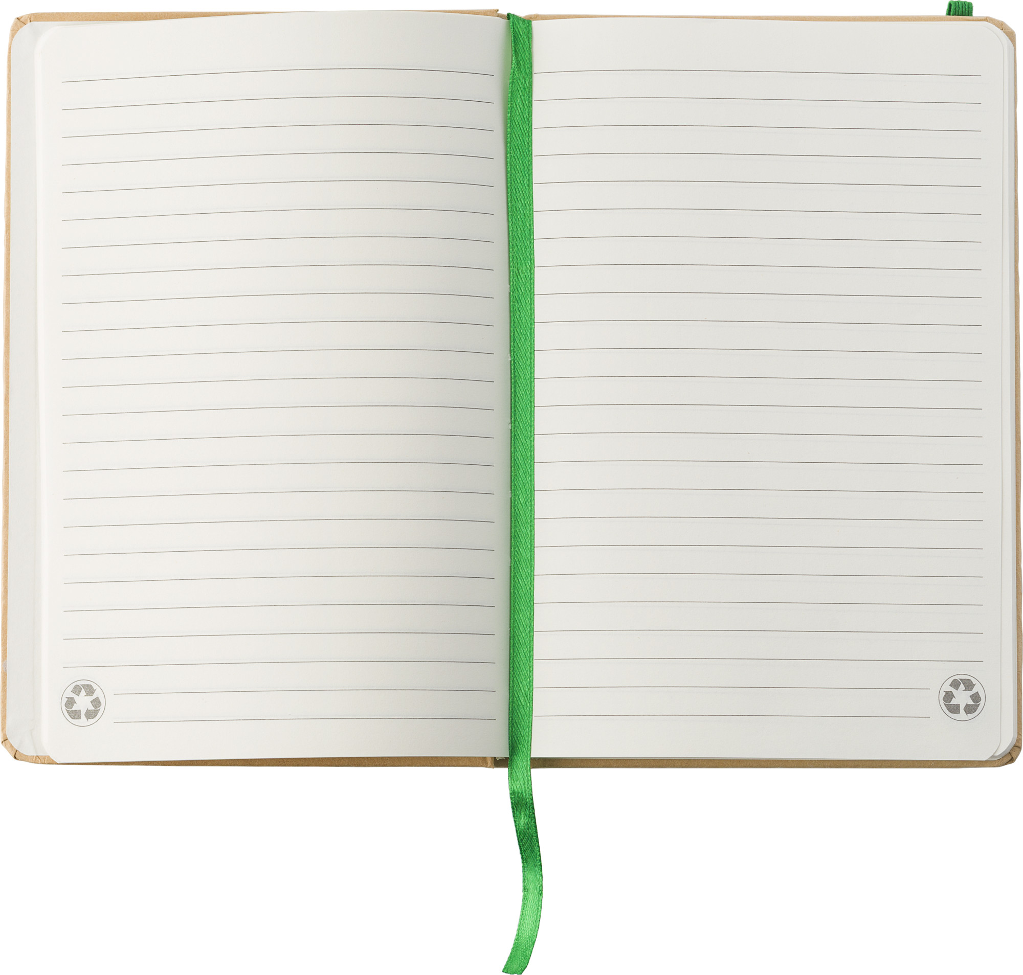 Notizbuch aus recyceltem Karton (A5) mit 160 linierten Seiten. Mit Gummiband zum Verschließen und Lesezeichen mit Band.