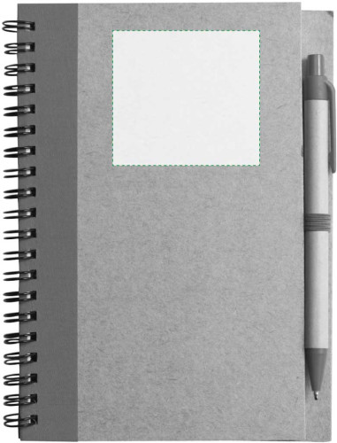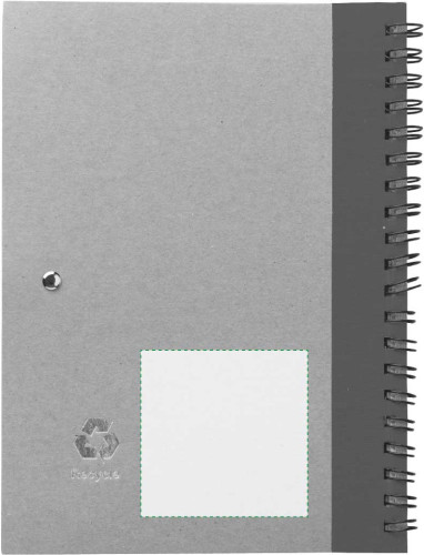Notizbuch aus recyceltem Papier mit Ringbindung und farbigen Applikationen mit 60 linierten Seiten inkl. Kugelschreiber aus Karton/Kunststoff mit blauer Mine.