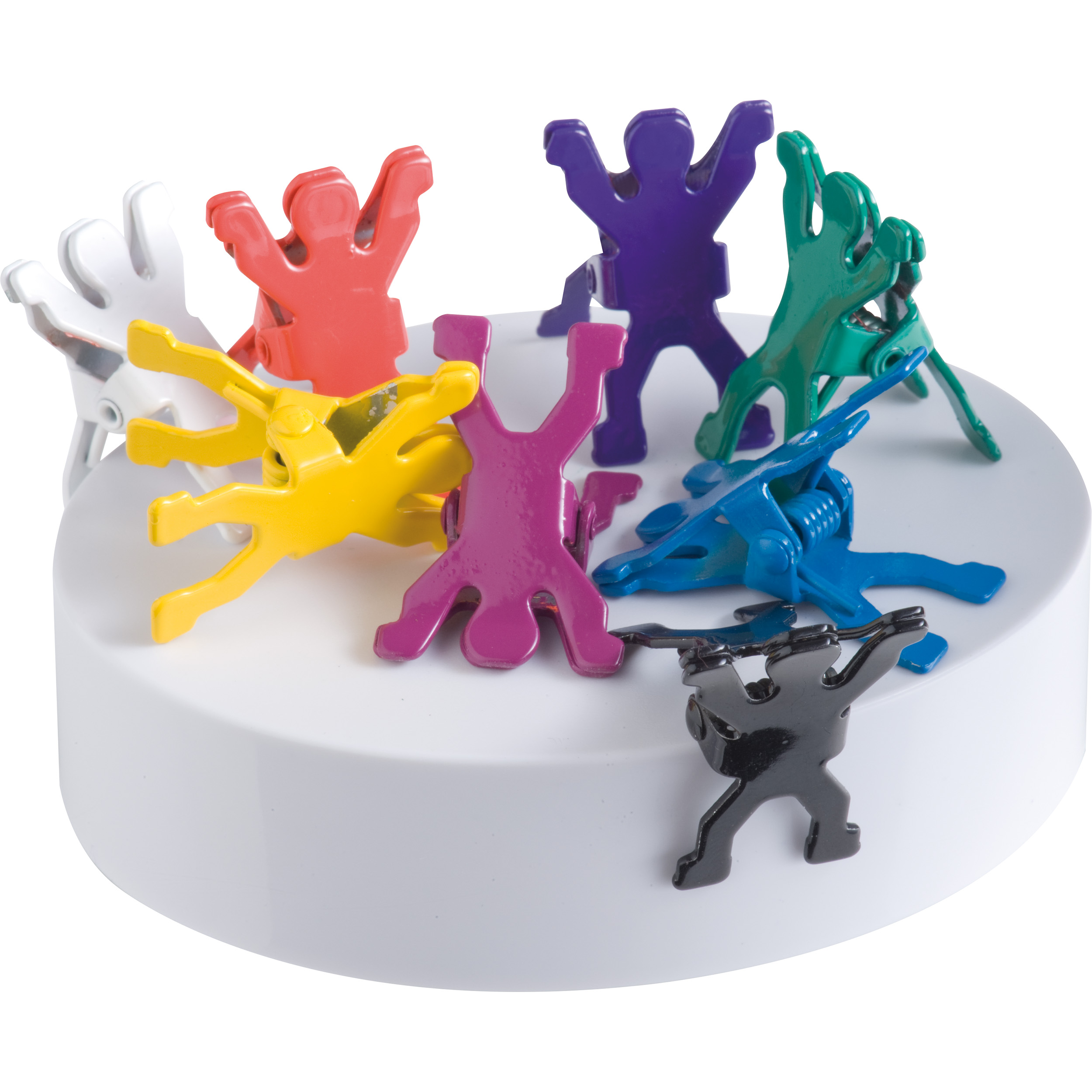 Die acht bunten Metallmännchen mit Klammer halten Notizzettel, Visitenkarten und vieles mehr auf der magnetischen Basis. Ihre Werbung drucken wir auf die Frontseite der Magnetbasis.
