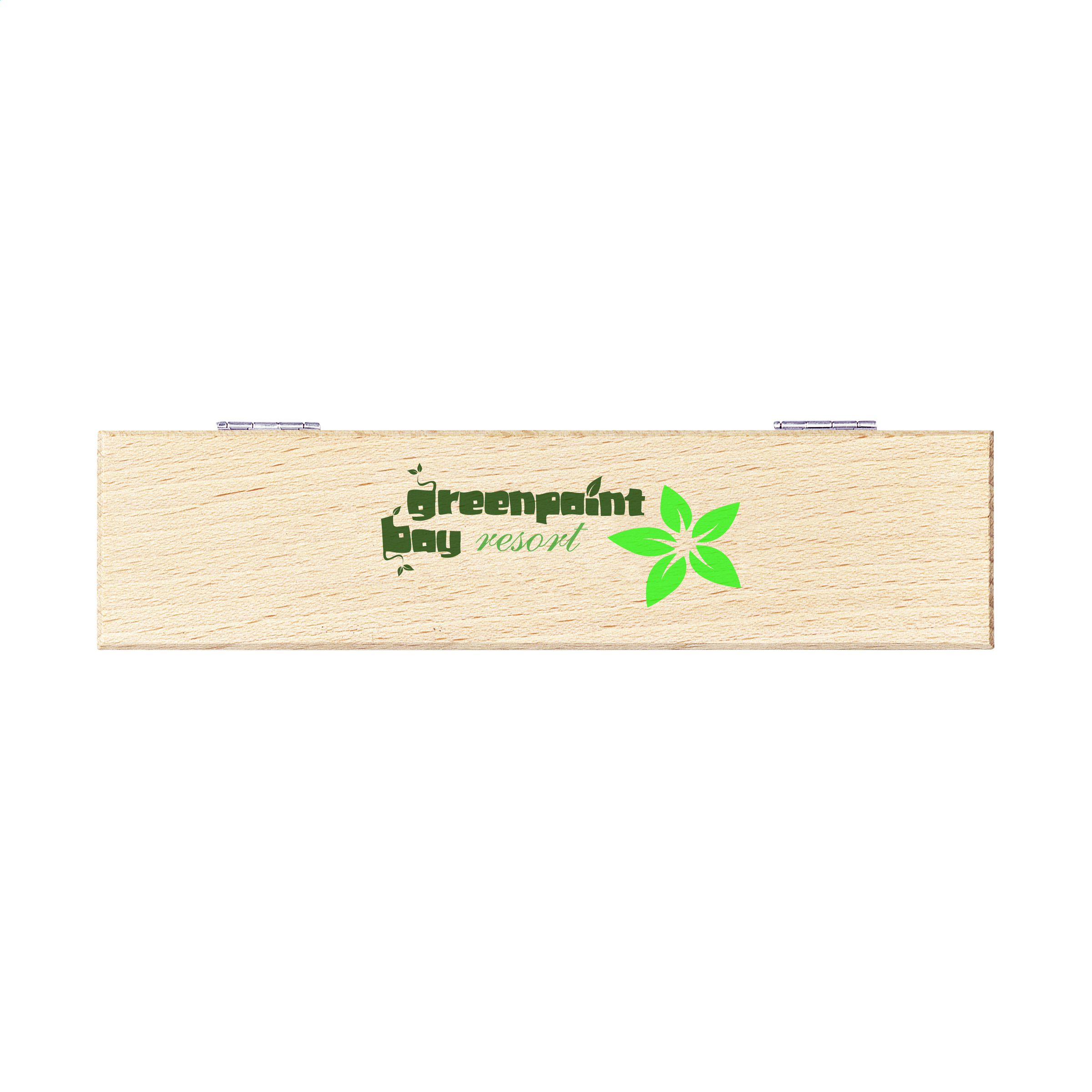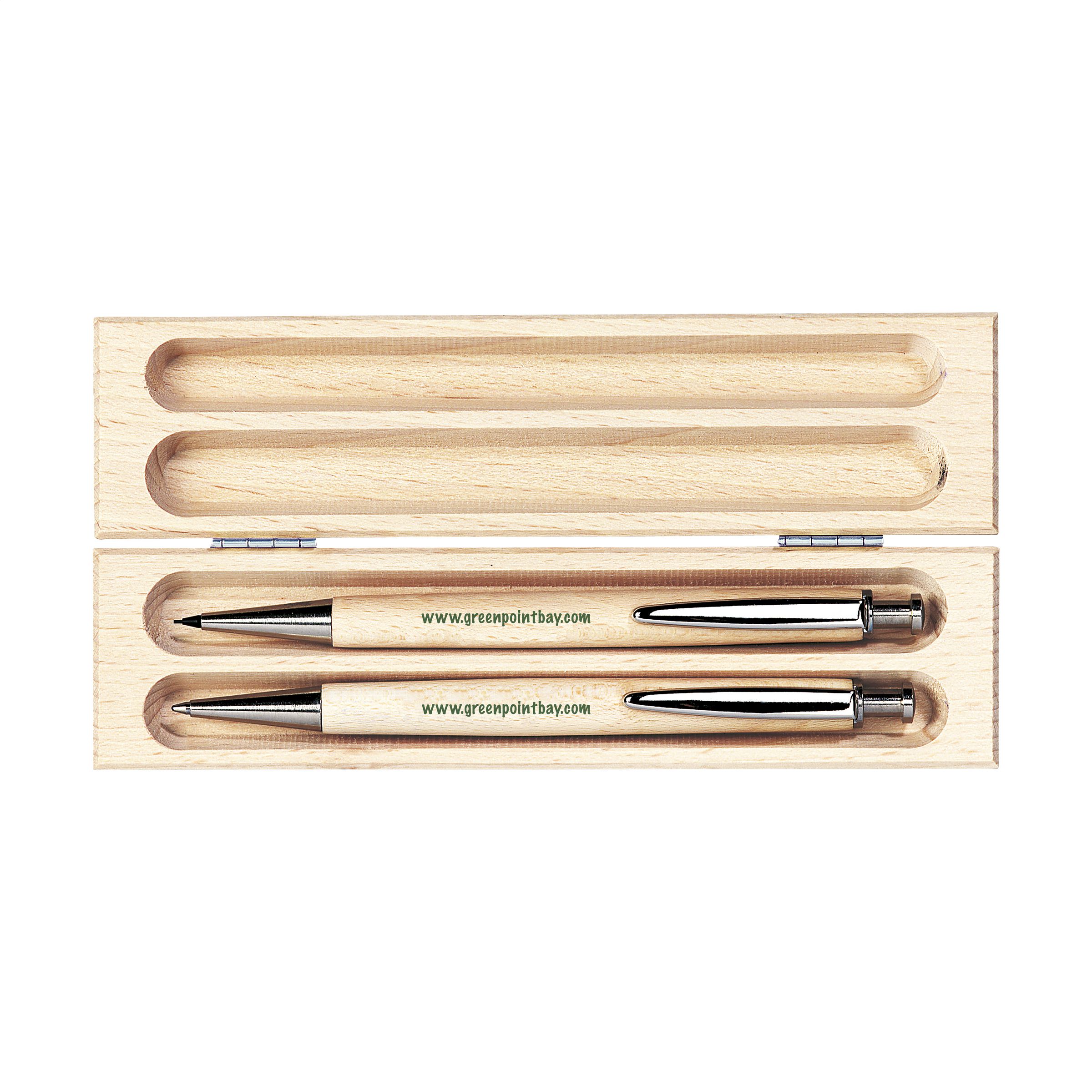WoW! Schreibset aus massivem Birkenholz: blauschreibender Kugelschreiber und Druckbleistift mit 3 HB-Minen (0,5 mm). Mit verchromtem Clip, Druckknopf und Spitze. In einer Kassette aus Birkenholz.