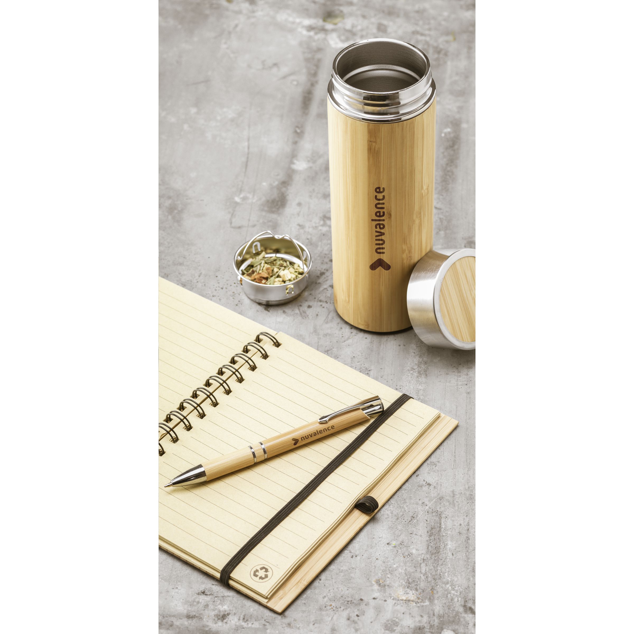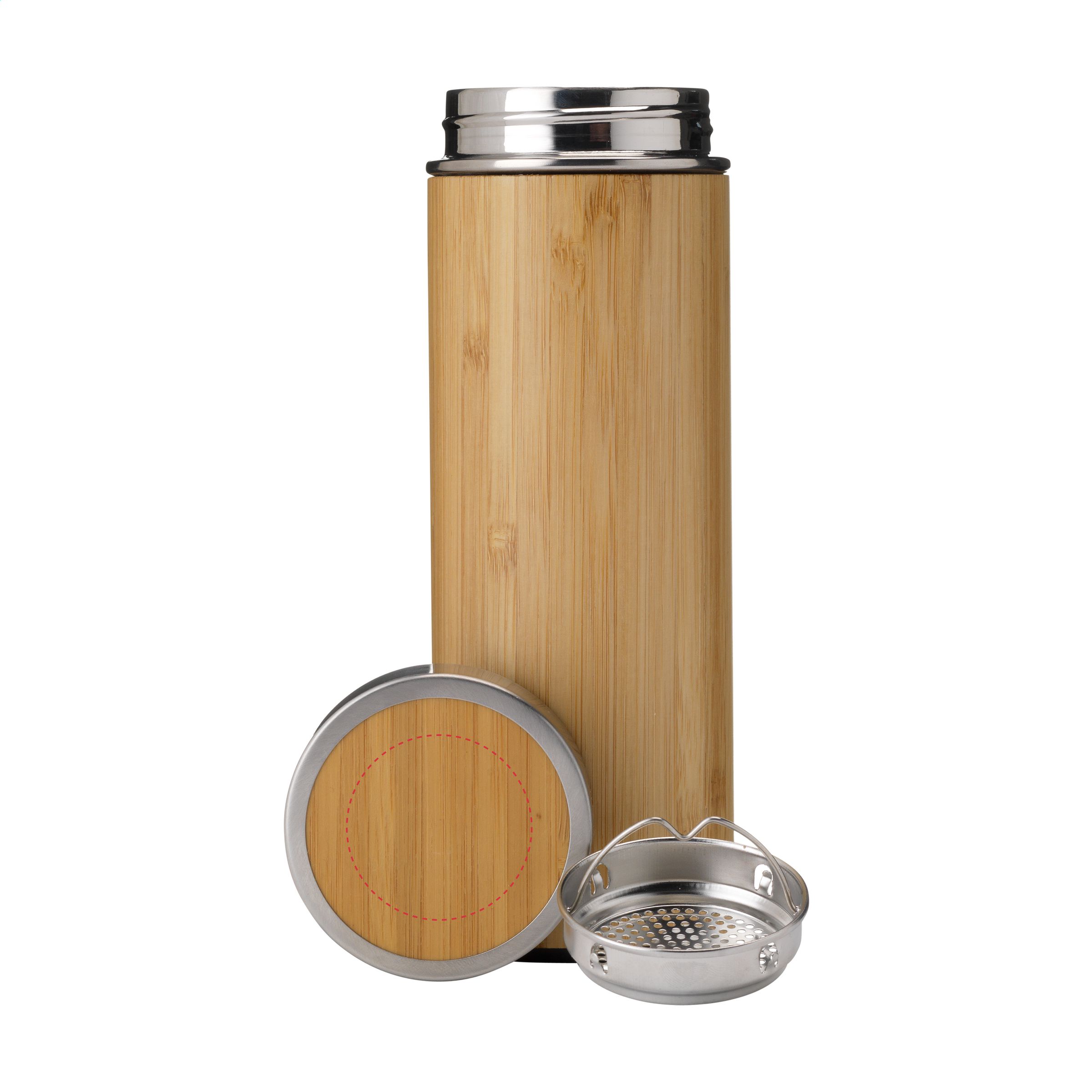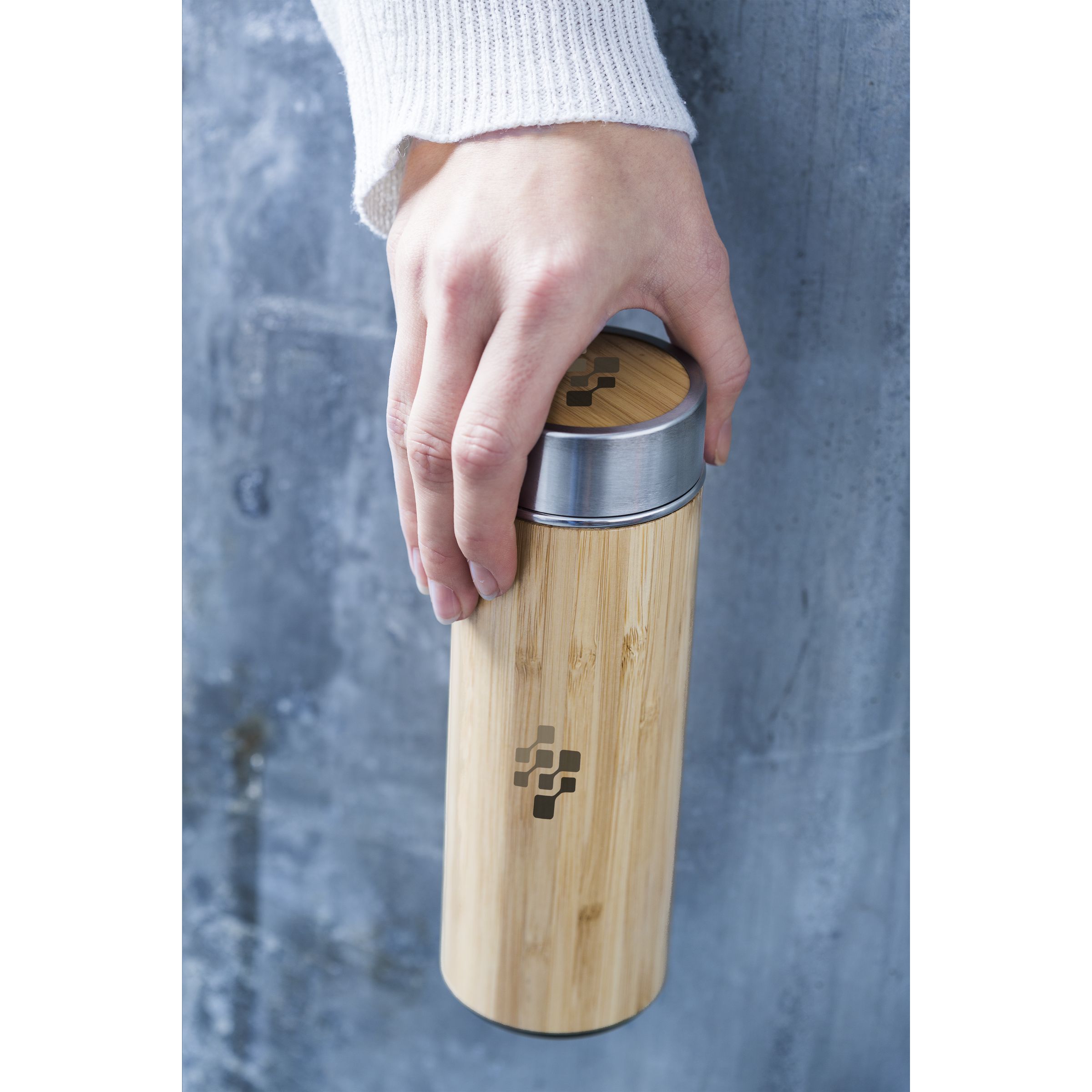 Doppelwandige, vakuumisolierte, auslaufsichere, Thermoflasche/ Thermobecher aus Edelstahl mit Bambus-Finish. Inklusive herausnehmbarem Teesieb aus Edelstahl. Fassungsvermögen 360 ml. Wird einzeln in einem Kraftkarton geliefert.