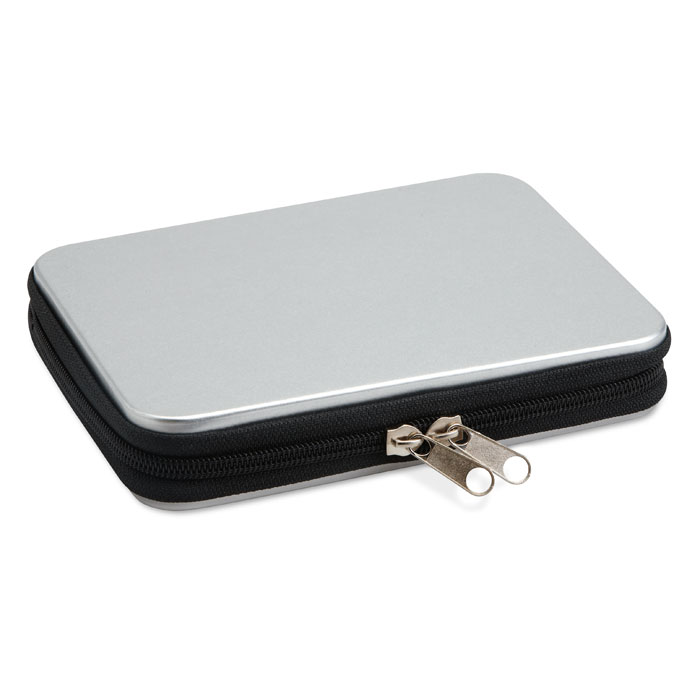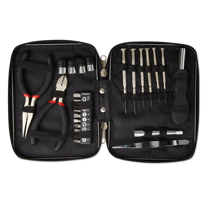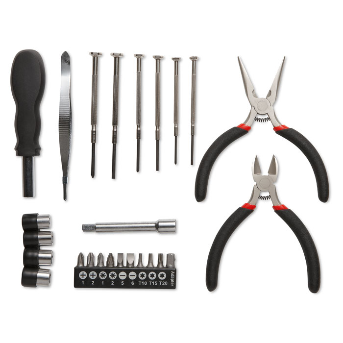 Werkzeugset im Alukoffer. Inklusive 1 Spitzzange, 1 Seitenschneider, 1 Schraubendreher, 1 Verlängerung, 10 Stück Bit-Satz, 1 Pinzette und 6 Präzisionsschraubendreher.