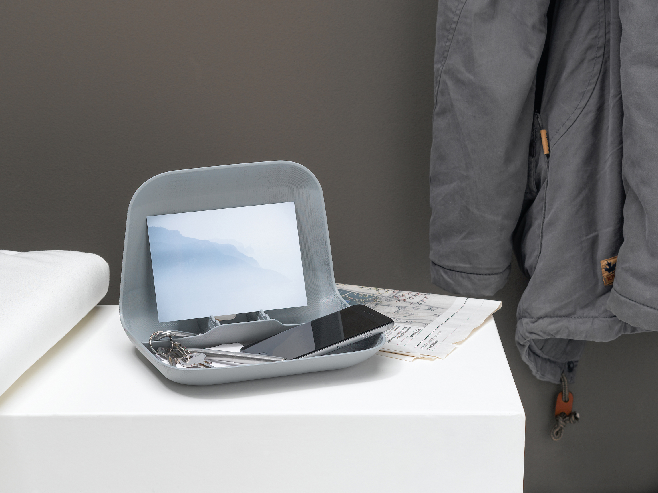 Als persönlicher Sekretär organisiert PRIVATE den Alltag im Büro und zu Hause. Hier ordnet er alle wichtigen Kleinigkeiten wie Schlüssel, Brille, Fernbedienung, USB-Stick, Schreibstifte, Radiergummi oder Büroklammern. Gleichzeitig gibt er sich in der Vertikalen als universeller Halter zum Präsentieren von Kochbüchern, Fotos, Postkarten und Computer-Tablets.