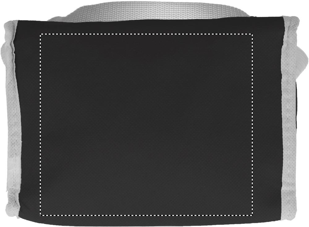 Kühltasche mit isolierender Aluminium-Folie für 6 Dosen. Außenseiten Non Woven mit weißen Absetzungen. 80 g/m². Isoliermaterial: Mit Aluminiumfolie laminierter Schaumstoff. Füllmenge 3L.